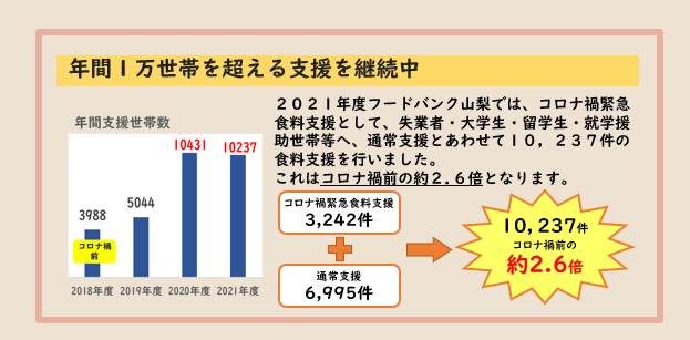 現在フードバンク山梨は、年間1万世帯以上の食料支援を行っていますが、コロナ禍に加え物価高騰により、支援を求める声がさらに増えています。
