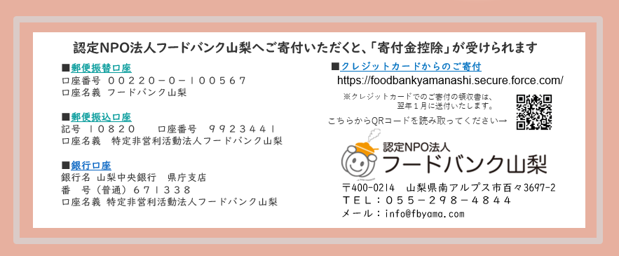 フードバンク山梨は8・9月を夏の寄付月間として、より多くの皆様に寄付金のお願いを呼びかけます。