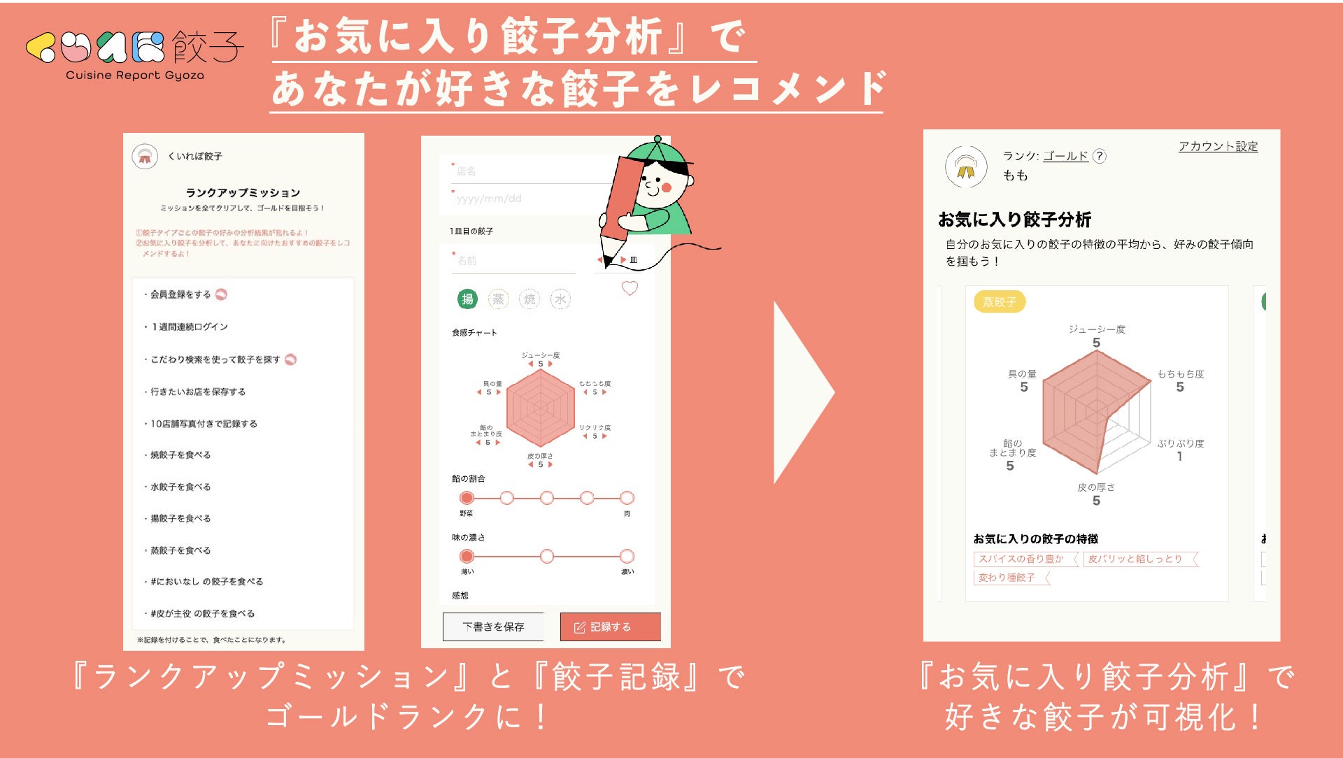 「くいれぽ餃子」では、餃子ランク制度があり、様々なランクアップミッションをクリアし、餃子を記録していくことで、あなた自身の餃子の好みを分析する「お気に入り餃子分析」を閲覧することができます。その分析結果を元に、その人にあったオススメ餃子をレコメンドします。