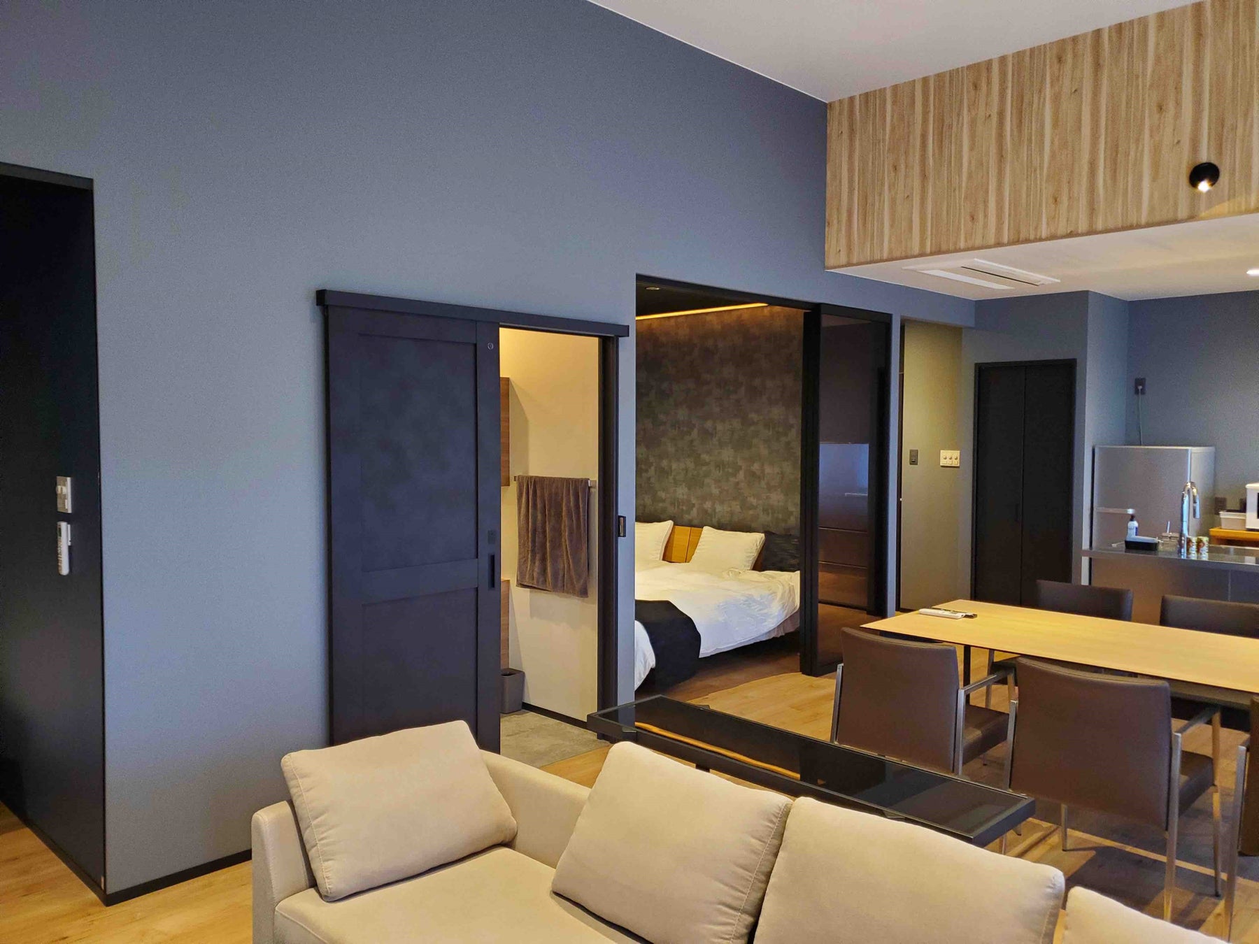 爽快なゴルフコースと共に、優雅なリゾートライフを彩るのが、クラブハウスから続くリラクシング&ラグジュアリーをコンセプトにしたホテルコンドミニアムでの滞在です。ゲストルームは天井高3.6m~5mの大空間で、アイランドキッチン、65インチの大型アンドロイドTV、洗濯乾燥機、家電製品、家具、食器等を完備しており、長期滞在にも対応。さらにペット同伴での滞在が可能な部屋も設けられています。