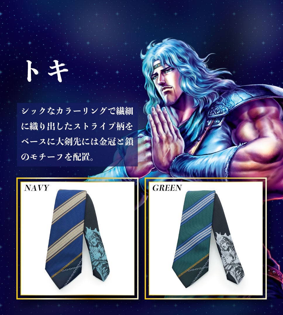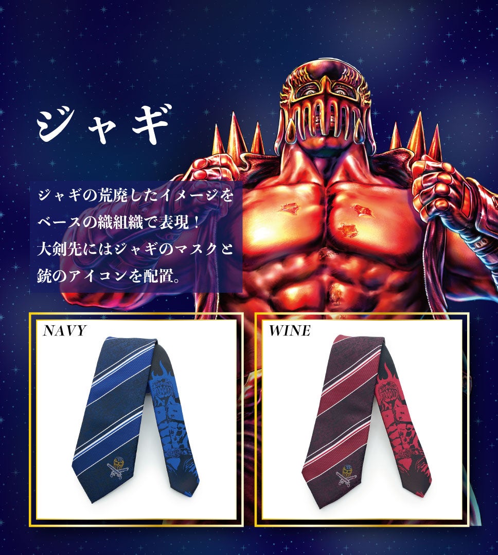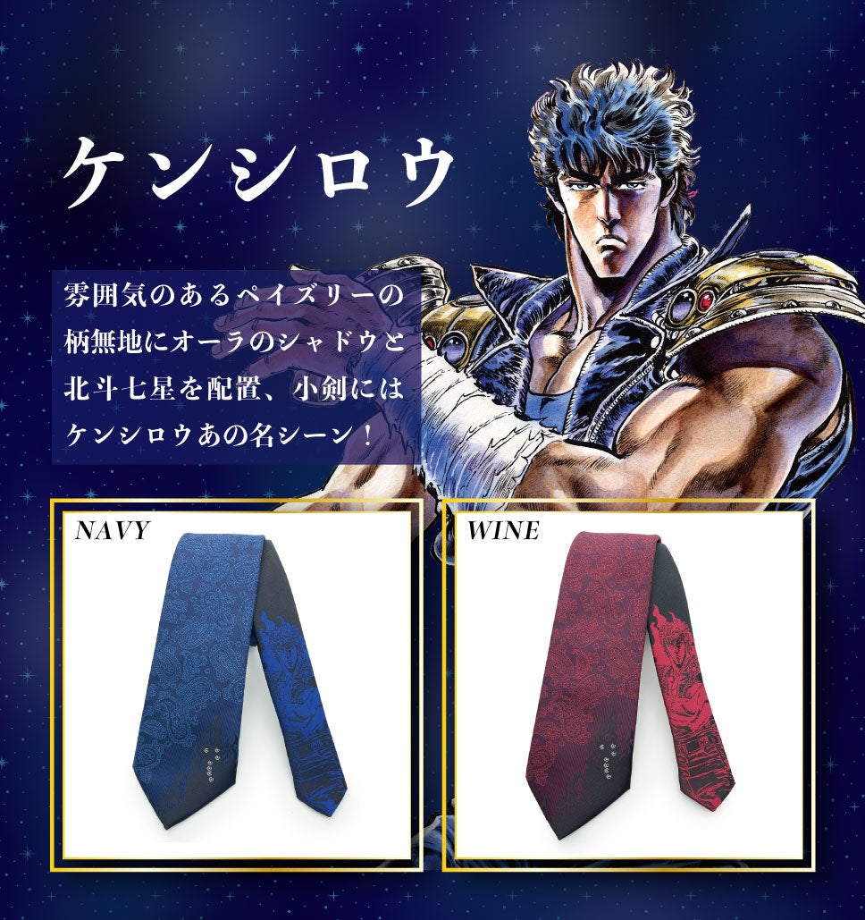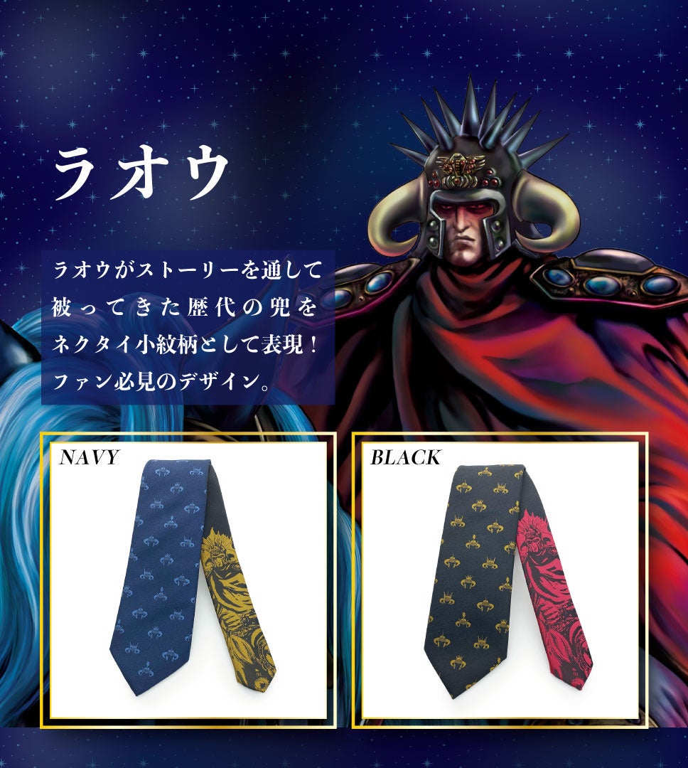 キャラクターのビジネスアイテムを専門に展開する㈱KFSが展開するブランドKYOTO ALAMONOより『北斗の拳』のネクタイが新登場いたしました。北斗の世界観、各キャラクターの要素をネクタイの柄に落とし込み繊細な織柄で表現しています。ビジネスシーンに溶け込むデザインを心がけ、普通に締められるがコンセプトの商品です。