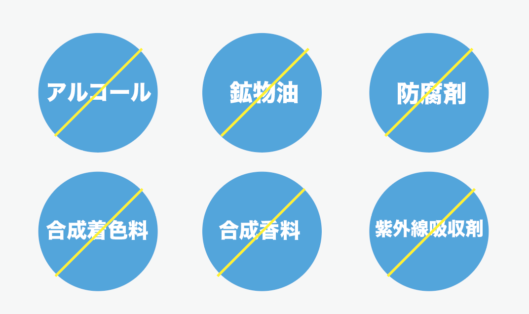 お肌をいたわるアルコール、合成着色料、鉱物油、合成香料、防腐剤、紫外線吸収剤を不使用。