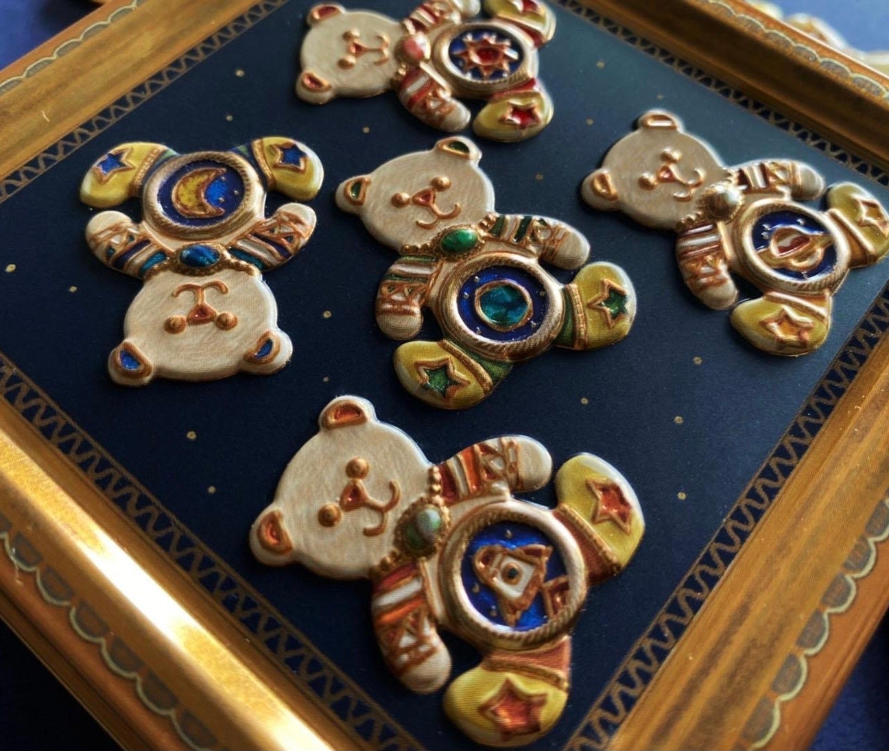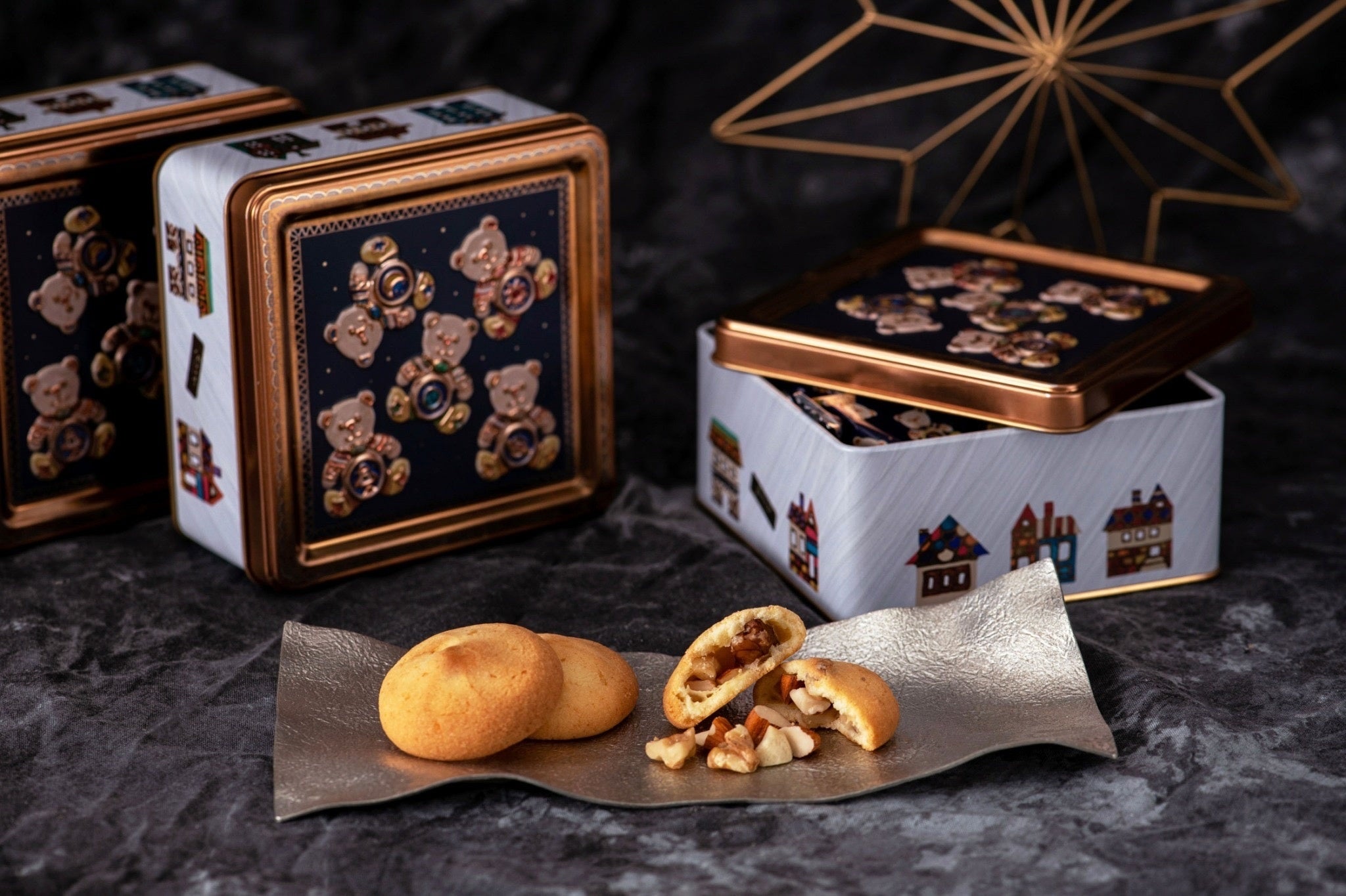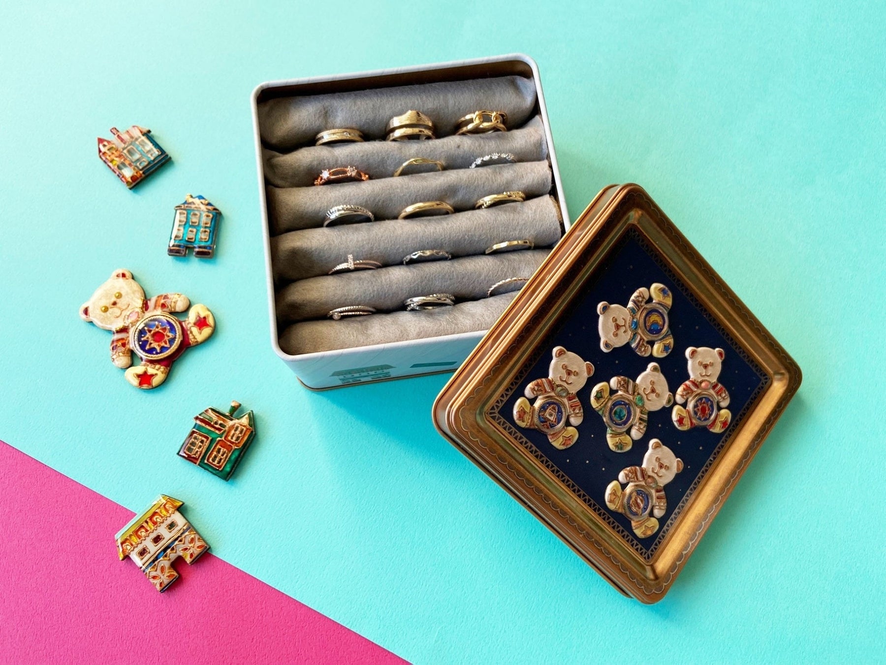 缶の側面には日本、アメリカ、イギリス、ドイツなど世界の街並みを描いた「街並みブローチ」を、缶の蓋には宇宙に浮かぶ「宇宙くまブローチ」が描かれています。アクセサリー作家 saryさんのブローチをイラストレーター 緒野まとぺさんに描いていただき完成しました。