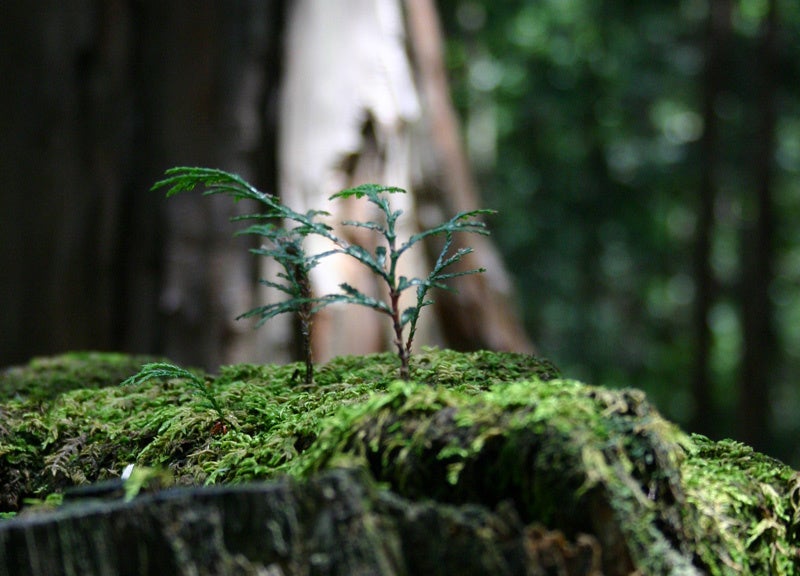 木曽ひのきは、その多くが朽ち果てて苔むした親木の切株の上に落ちた種が発芽し、その幼木が三百年もの歳月、厳しい風雪に耐え成木となります。