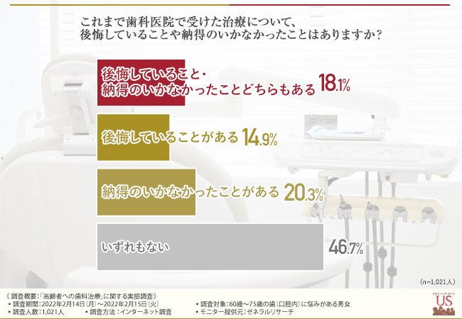 歯科医院で治療を受けた高齢者の半数以上(合計で53.3%)が、納得のいかないことがある・後悔していることが分かりました。