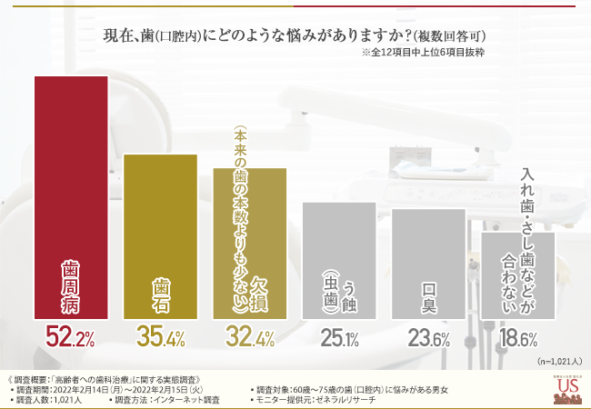 そこで今回、『アス横浜歯科クリニック』(https://www.us-shika.com/)をはじめ、東京(二子玉川・豊洲)・横浜(センター南)で歯科クリニックを運営する医療法人社団 聖礼会は、60歳~75歳の歯(口腔内)に悩みがある男女を対象に、「高齢者への歯科治療」に関する実態調査を実施しました。