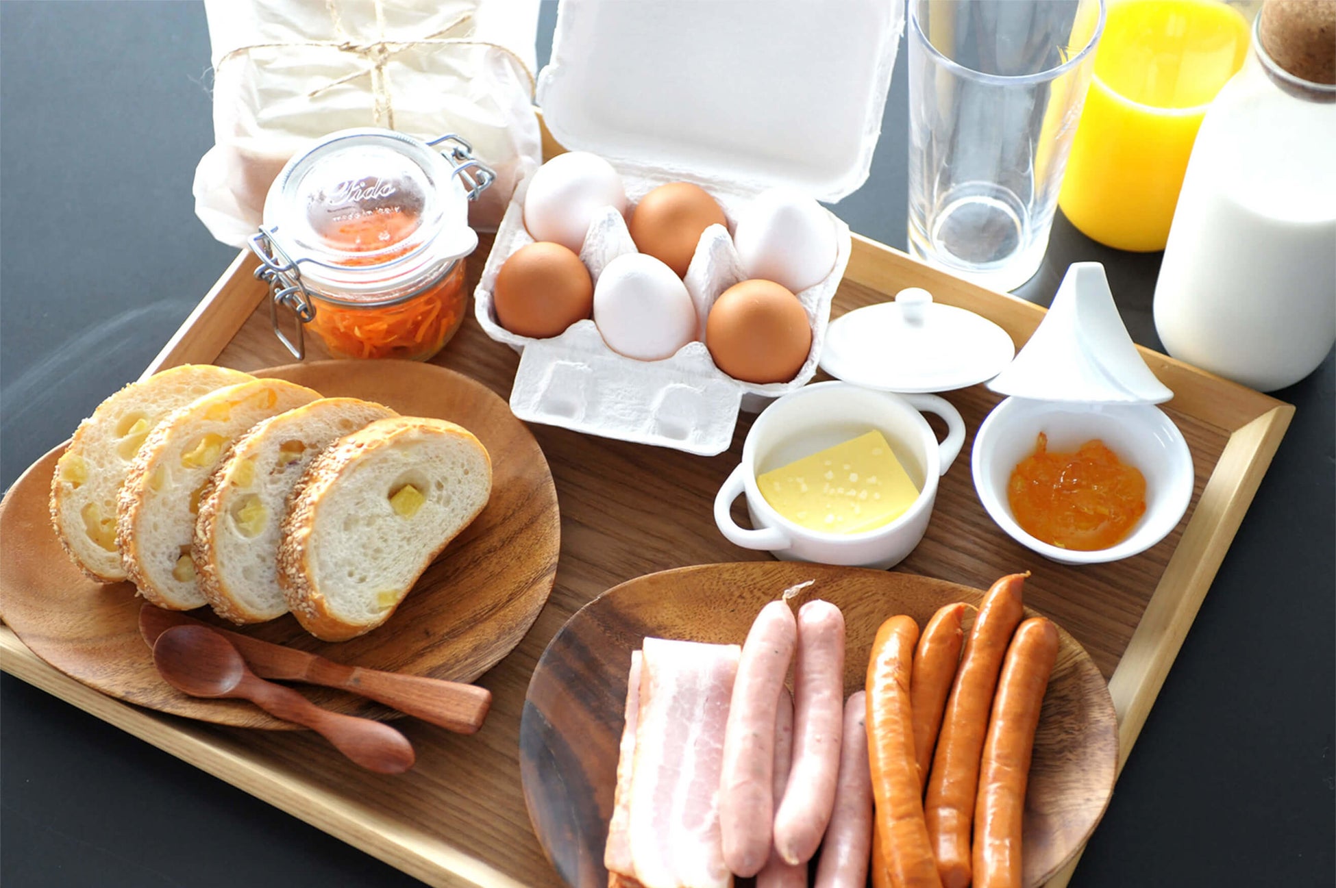 おいしいパンとソーセージ、ベーコン、卵などをお部屋にご用意。備え付けのキッチンと調理器具を使って頂き、お部屋で簡単に調理していただく形式の朝食です。常連のお客様がよく作られるのはホットサンド。別荘オーナーになった気分で、ホテルや旅館とはまた違った素敵な朝をお迎えください。