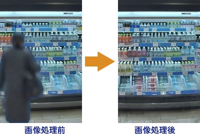 特許出願済みのNEC独自技術で人物消去機能を基本機能として搭載しています。人の映り込みを消去することで商品棚の状態を安定して確認でき、プライバシーに配慮したカメラ映像の管理ができます。