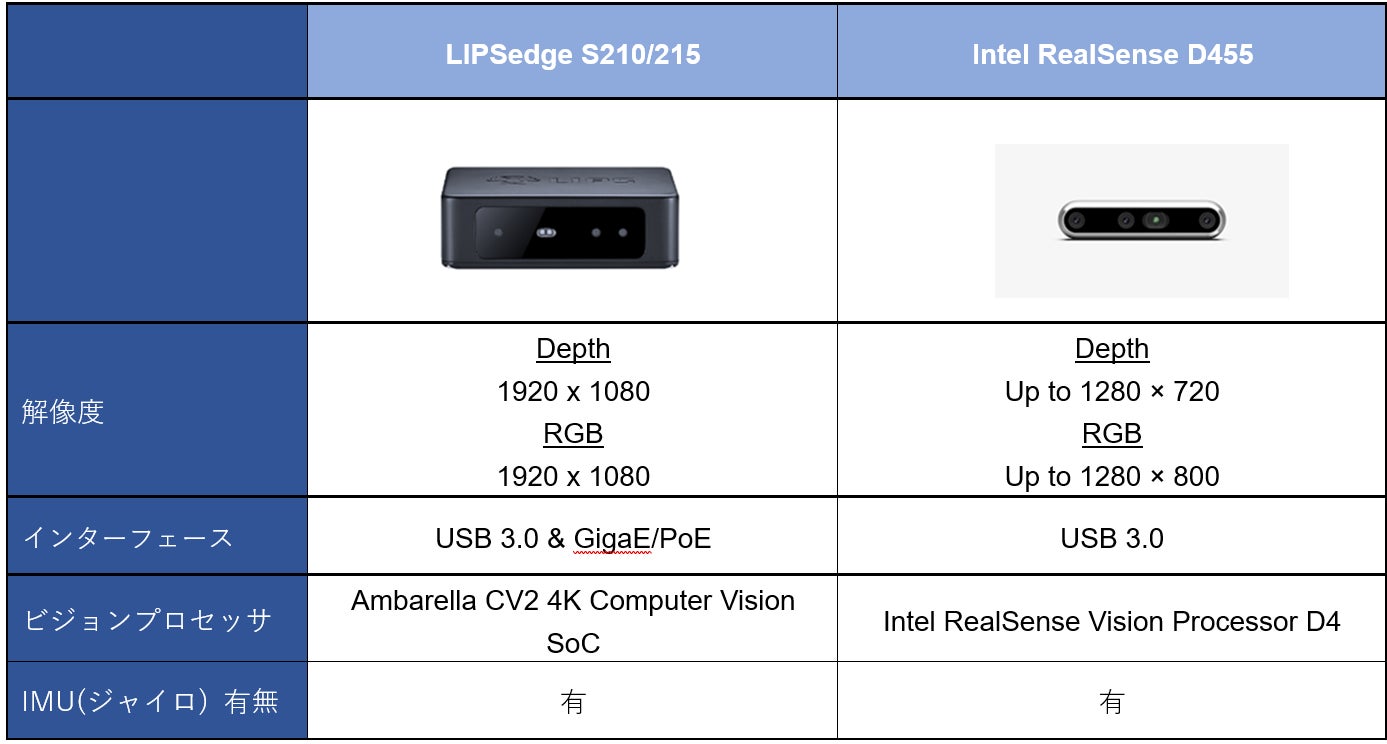 <LIPSedge S210/215 vs. Intel RealSense D455のスペック比較>