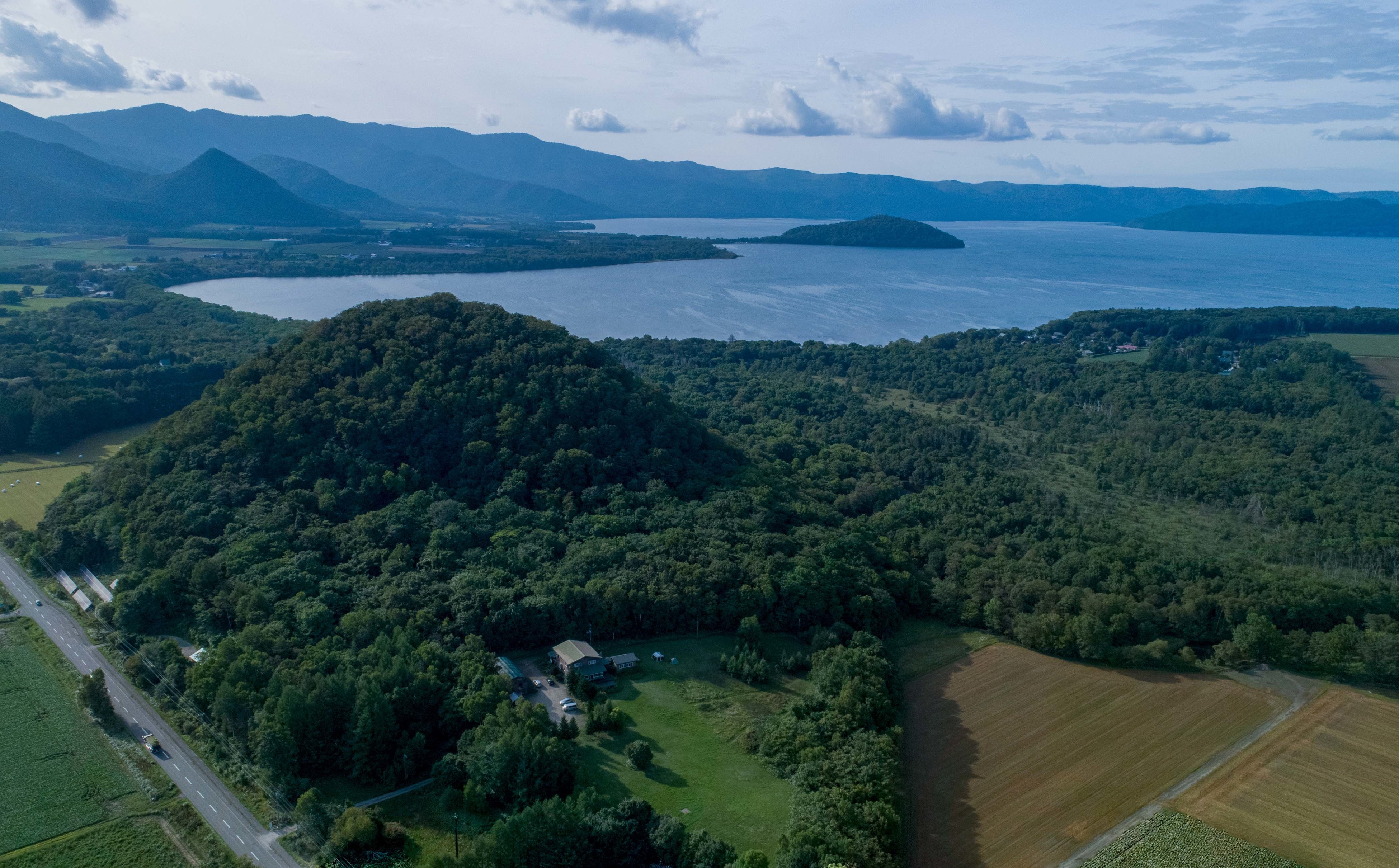 宿泊施設のすぐそばには「丸山」があり、その背後には屈斜路湖が広がっています。また、屈斜路湖から流れ出す釧路川は敷地内に面しています。