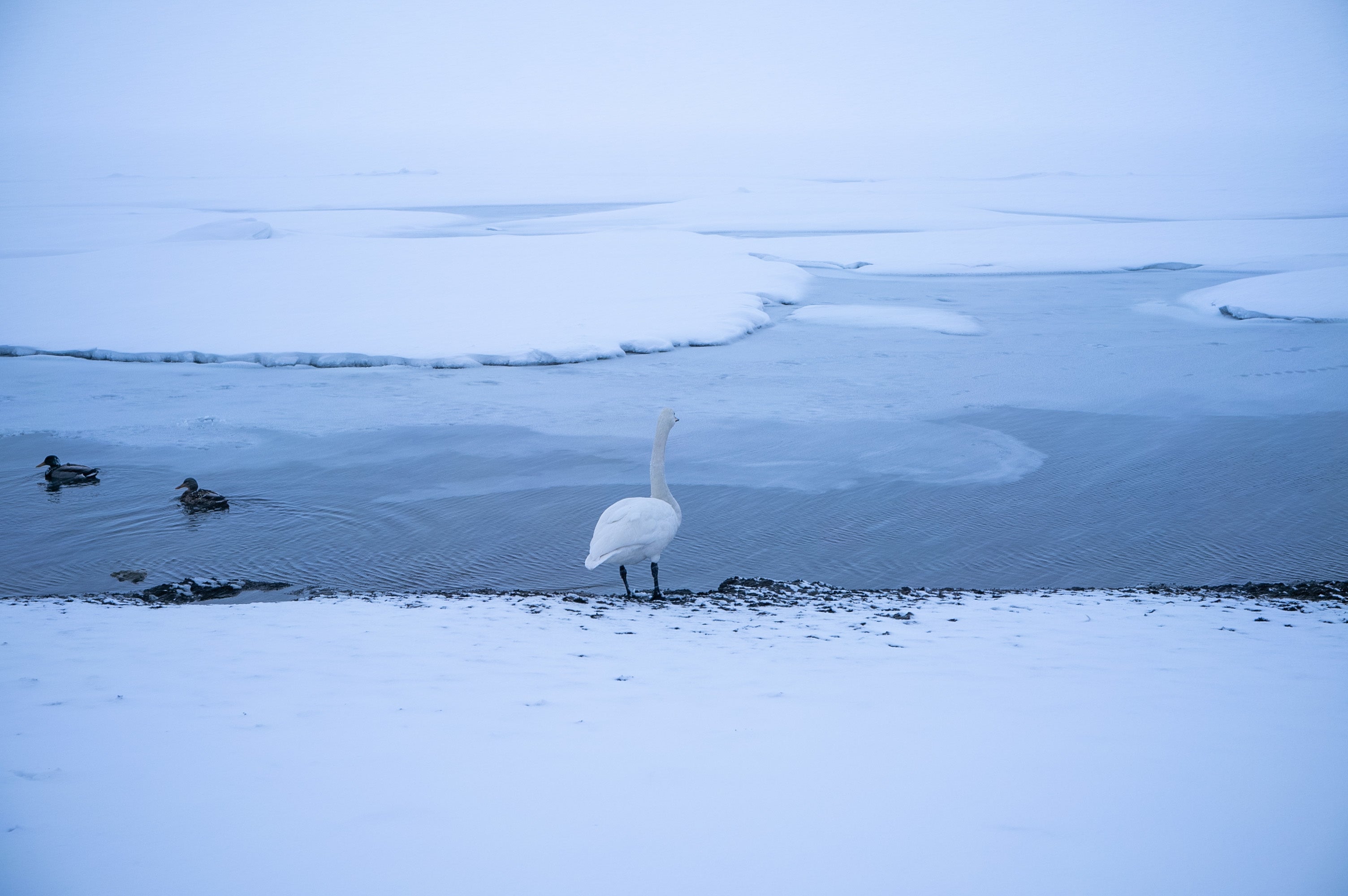 シベリアからやってきたオオハクチョウと結氷した屈斜路湖。白銀の世界で心を研ぎ澄ませる。