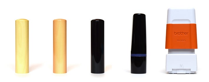 印材を彫刻する印鑑タイプは「薩摩本柘」「アカネ」「黒水牛」の12mm、13.5mm、15mmサイズからお選びいただけます。手軽に捺印できるインク内蔵認印タイプは「認印10mm」「認印18mm」の朱色インクと黒色インクをご用意しております。