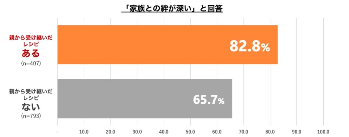 「親から受け継いだレシピがある」と回答した人の82.8%が「家族との絆が深い」と回答し、「親から受け継いだレシピがない」と回答した人より17.1ポイント多い結果に。このことから、「親から受け継いだレシピ」が家族との絆を深める可能性が判明。