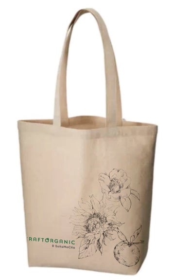 廃棄する衣類をアップサイクルして作られた再生コットン素材のトートバッグ。ユズ、ヒマワリ、ツバキのイラスト入り。