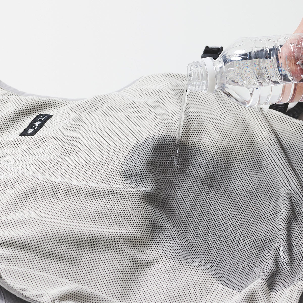 「水冷&空冷 ダブルクーリングベスト」は水をかけるだけでひんやりするクールベストです。保水性の高い新素材で「水冷」、メッシュ素材で「空冷」の効果を実現した強いひんやり感・ひんやり感が長持ちするベストです。汗さえも水分として吸収してひんやり感を生み出します。着用時は爽快なひんやり感でクールダウンします。