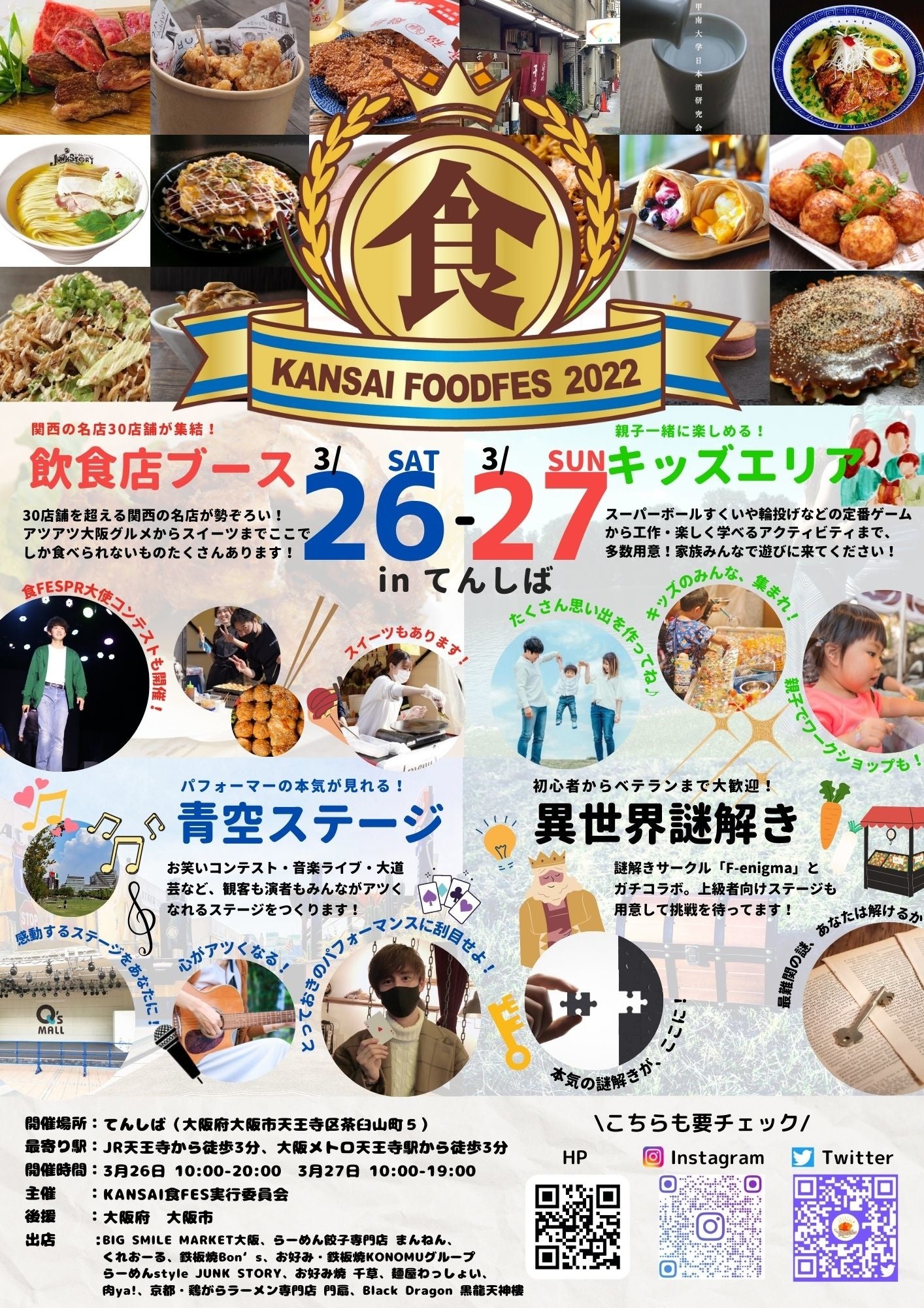 FoodFes株式会社(代表取締役:稲垣一馬)は2022年3月26日(土)、 27日(日)の2日間、大阪天王寺公園”てんしば”にて「KANSAI食FES2022」を開催いたします。
