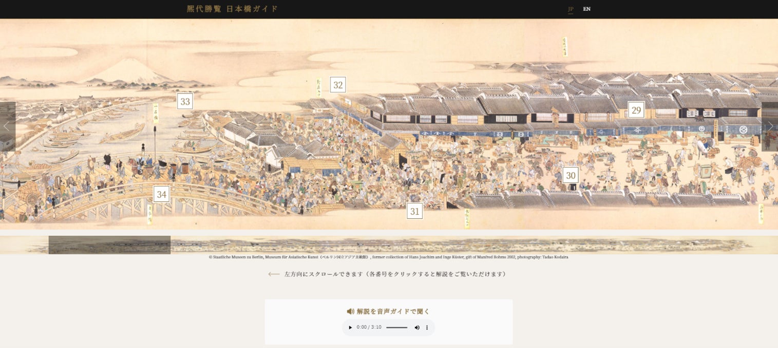 今回のWebサイトの作成にあたっては、「熈代勝覧」絵巻の原画を所蔵しているベルリン国立アジア美術館に画像の掲載許可を得て、江戸東京博物館名誉研究員の小澤弘氏の監修により、東京都江戸東京博物館、公益財団法人東京観光財団、東京都中央区など幅広い協力を得て作成いたしました。