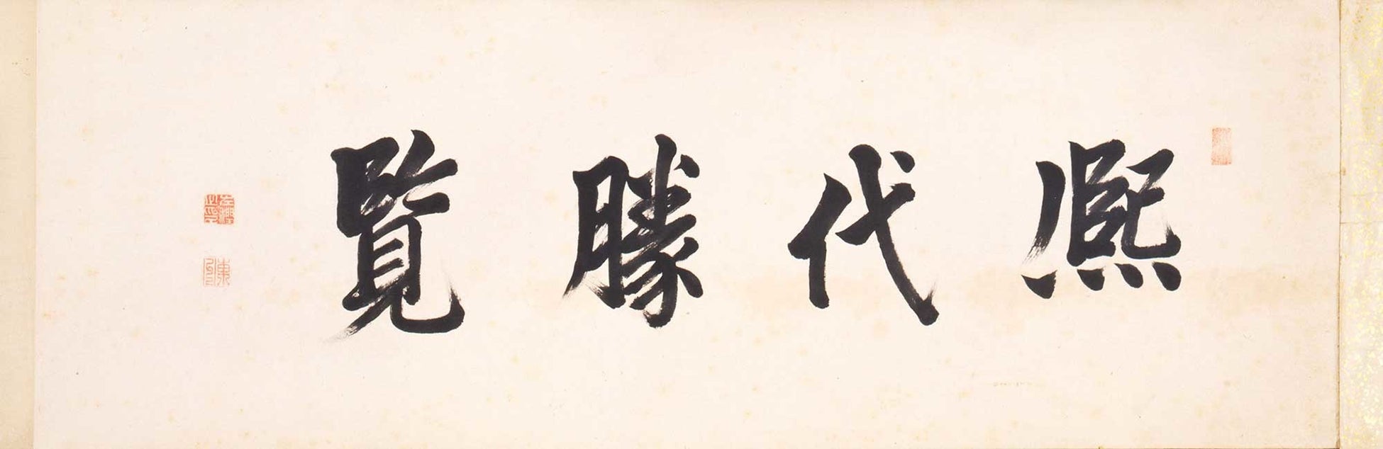 「熈代勝覧」とは、「熈(かがや)ける御代の勝(すぐ)れたる景観」という意味で、絵巻の題簽(だいせん)には「熈代勝覧 天」と記載されており、元は「天地人」の全三巻の可能性がありますが、他の巻は現在所在不明です。
