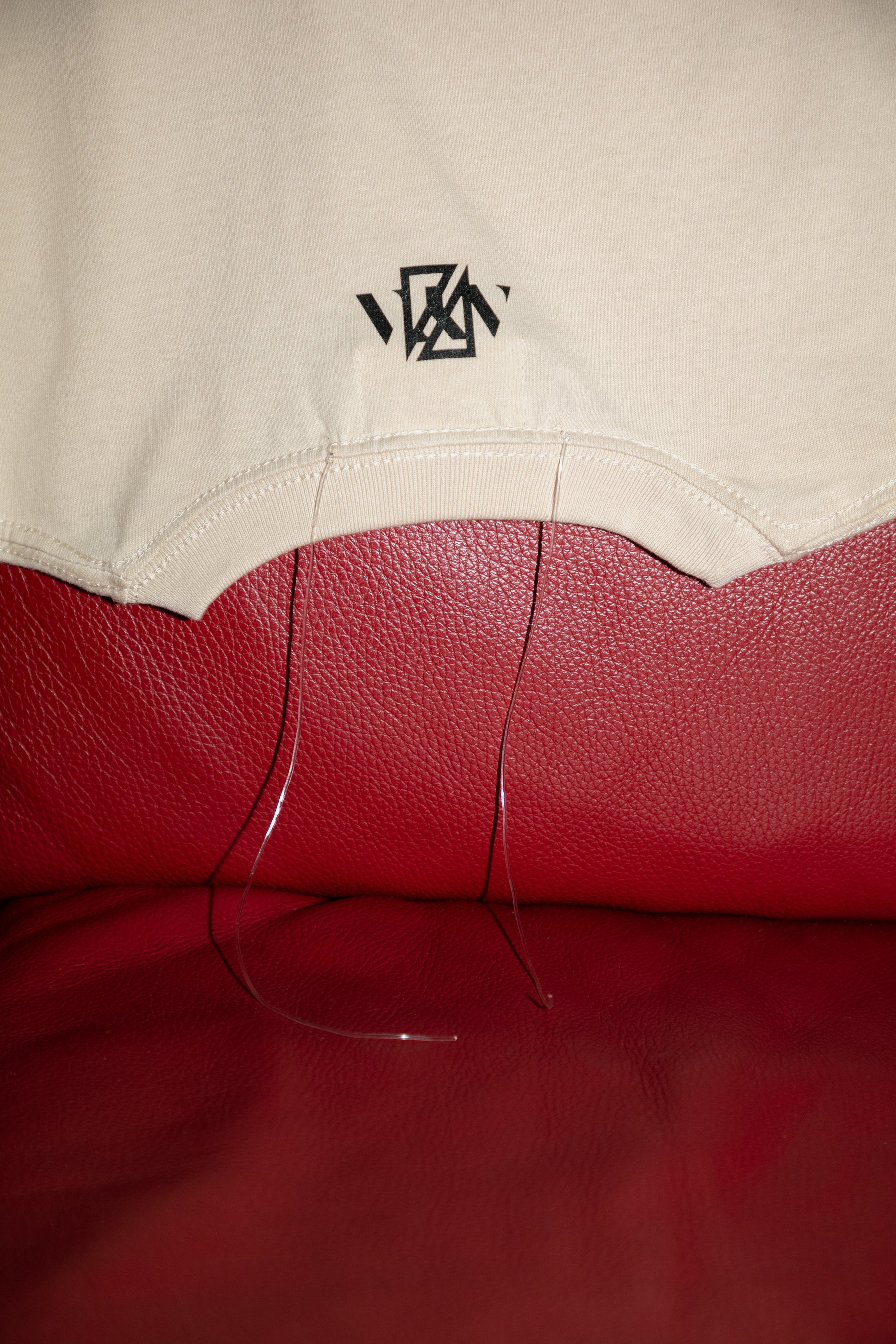 ロングスリーブTシャツのフロントには、PRESTIGE APPARELとAYAのロゴが重なって大胆にプリントされ、バックの首元には両者のロゴに加え、AYAのブランドアイコンでもある透明糸が施されています。
