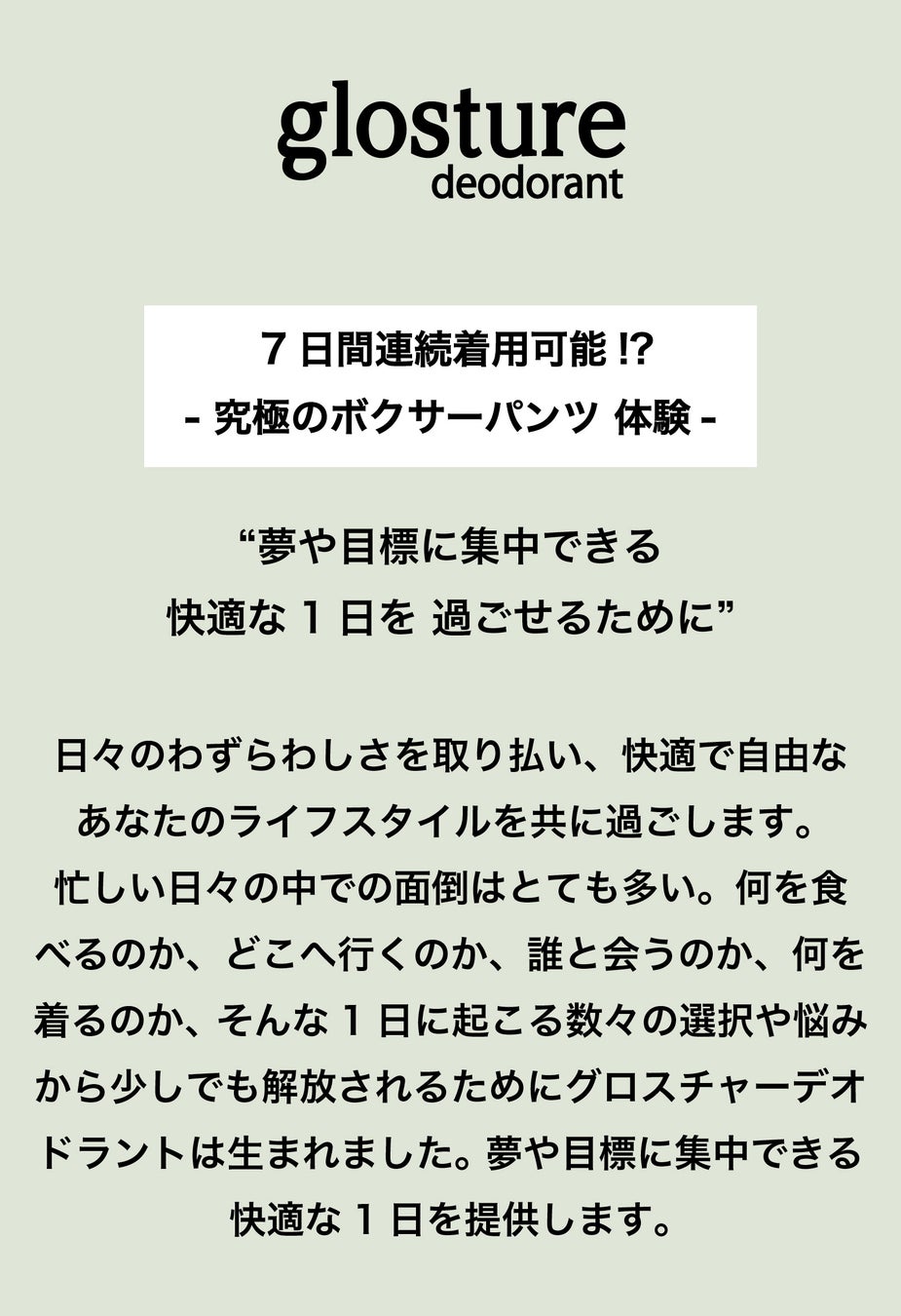 忙しい日々の中での面倒はとても多い。 何を食べるのか、どこへ行くのか、誰と会うのか、何を着るのか、そん な1日に起こる数々の選択や悩みから少しでも解放されるために グロスチャーデオドラントは生まれました。