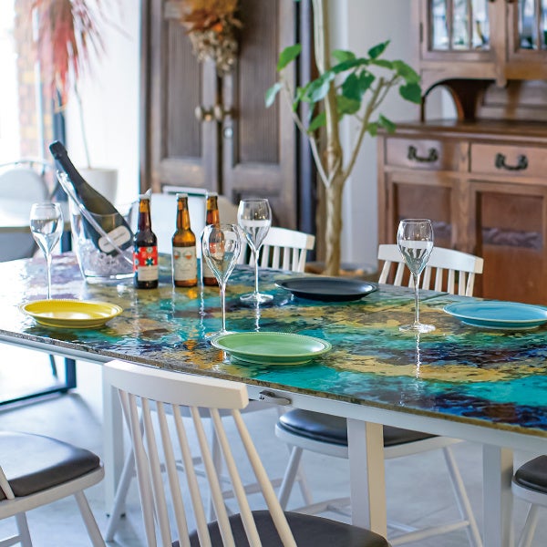 まるでアドリア海のような美しいブルーが目を惹くテーブル。熱や水に強い溶岩の天板に、色鮮やかで艶やかなガラス塗料のデザイン。サイズと色のオーダーが可能で、1点1点職人による丁寧な手仕事で仕上げられています