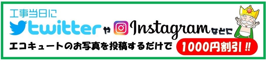 応募方法:工事当日に、「施工させて頂いたエコキュートのお写真」と「エコの王様でエコキュート設置しました」とコメントして頂くだけで、ご請求金額から1,000円お値引させて頂きます。