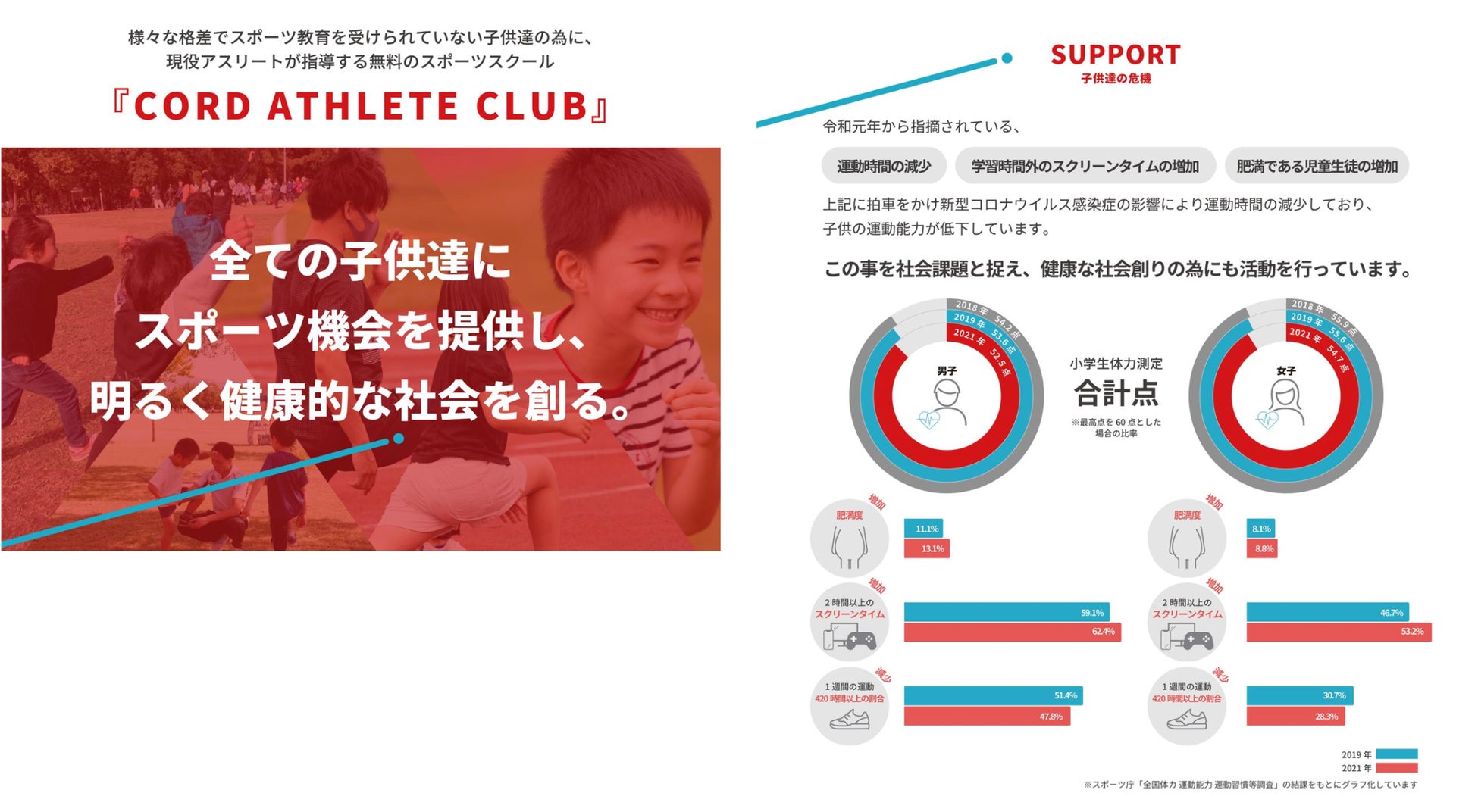 子どもたちにとって、体を動かすことの楽しさを認識し、スポーツを通じた仲間との協調性や目的達成へのプロセスを経験することは心と体の成長を育むうえで極めて重要だと考えています。生涯を通して心と体を健康に、幸せな生活を営むために、そしてスポーツがライフスタイルの中に当たり前に組み込まれた社会を実現するために、 CORD PROJECTでは子供のスポーツ環境の改善と実行を続けてまいります。