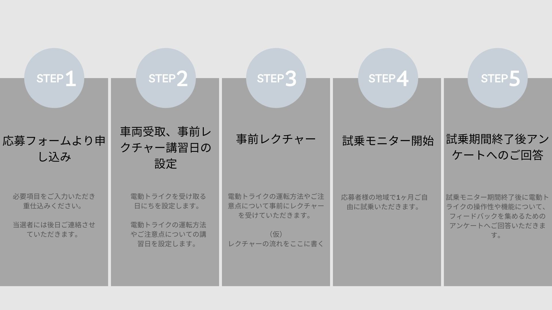 この課題を解決するために、まずは多くの方に電動トライクを利用していただくことで、電動トライクが事故を起こしにくい乗り物だということを体感していただく必要があると考えます。