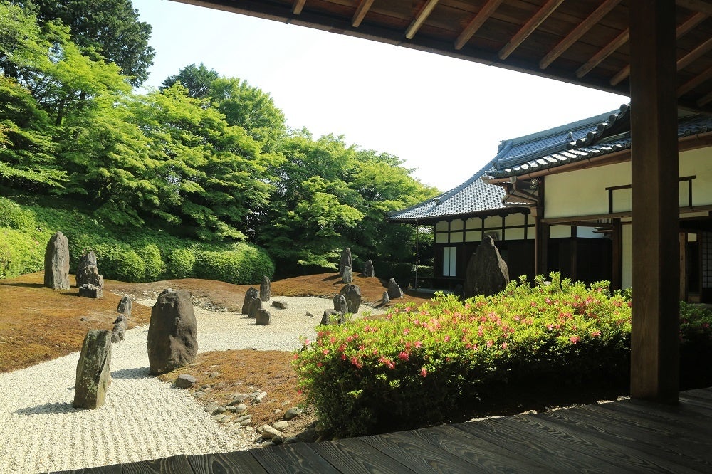 俳諧の祖とされる松永貞徳により作庭された「雪月花の三名園」のうち、比叡山を借景にした「雪の庭」を有する古刹。5月上旬から中旬にかけ、山門前に咲く約3,000株のツツジは圧巻です。