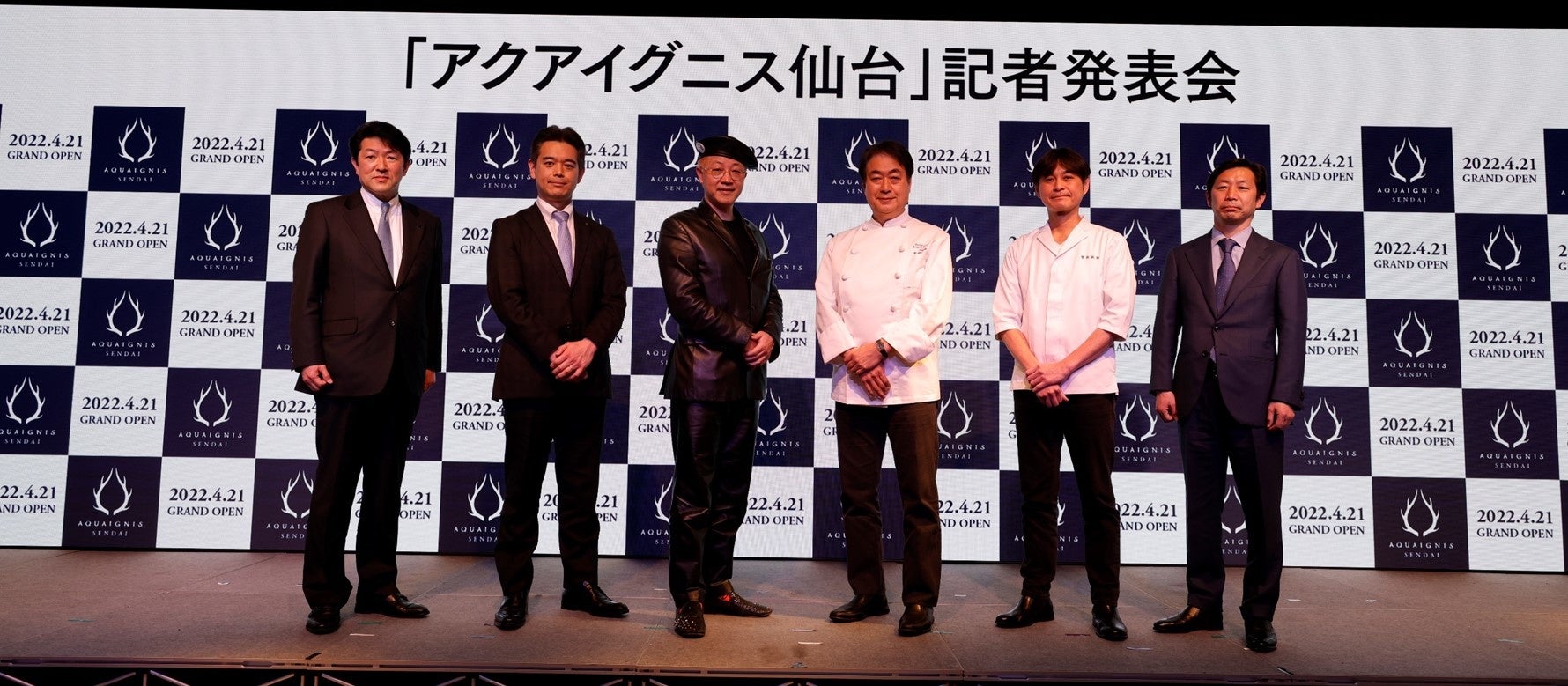 仙台reborn株式会社は本日、2022年4月21日に東北復興のシンボル施設として仙台市若林区に開業予定の「アクアイグニス仙台」オープン記者発表会を新仙台ビルディング1F「CROSS B PLUS」において開催いたしました。発表会には、当社代表取締役 深松努、当社取締役 立花哲也、当社取締役 福田大輔、そして施設内の食のプロデュースを行なうパティスリー・ショコラトリー・ベーカリー監修の辻󠄀口博啓シェフ、イタリアン監修の日髙良実シェフ、和食監修の笠原将弘シェフが出席しました。