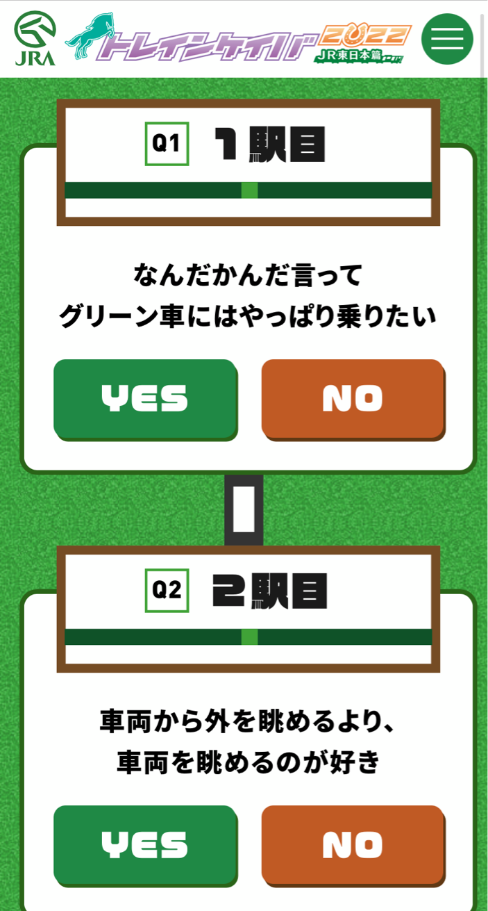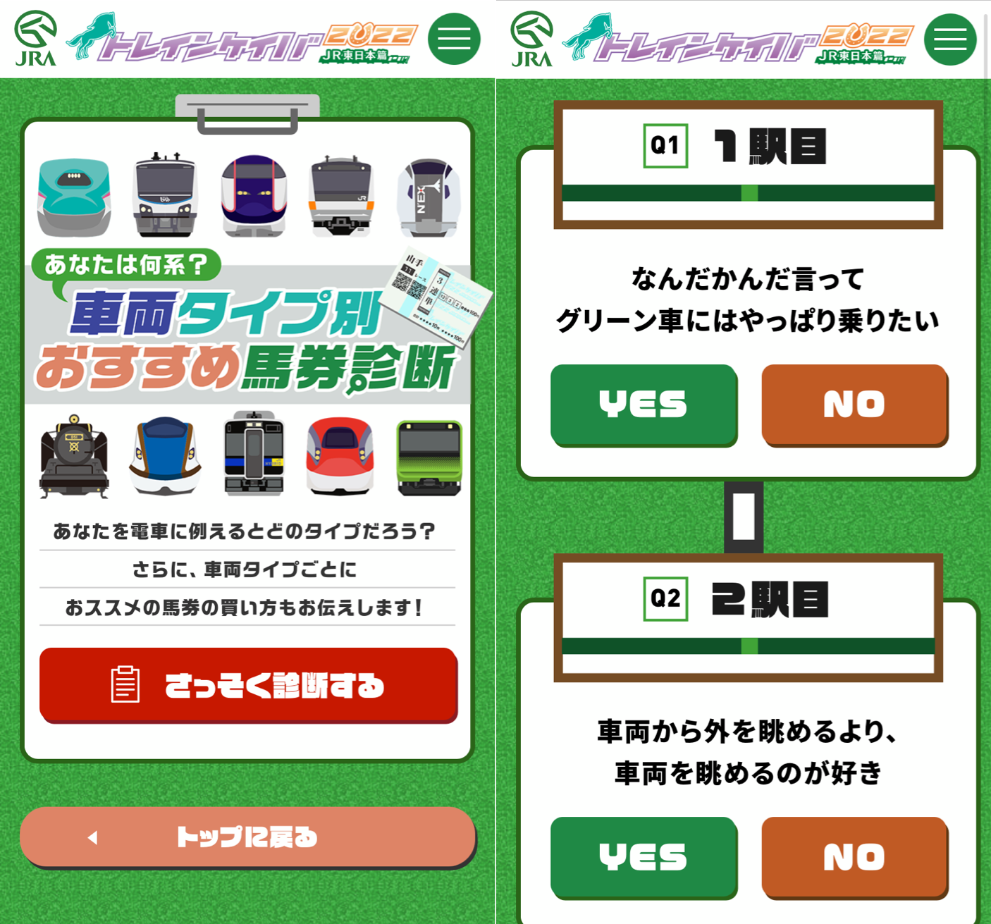 また、JRA-FUNサイト上では「あなたは何系?車両タイプ別おすすめ馬券診断」も開催。たった6問に答えるだけで、性格をJR東日本の車両別に表現し、おすすめの馬券の買い方までお伝えする診断コンテンツです。5月には『めざせ競馬場!乗り換えチャレンジ』もスタートします。