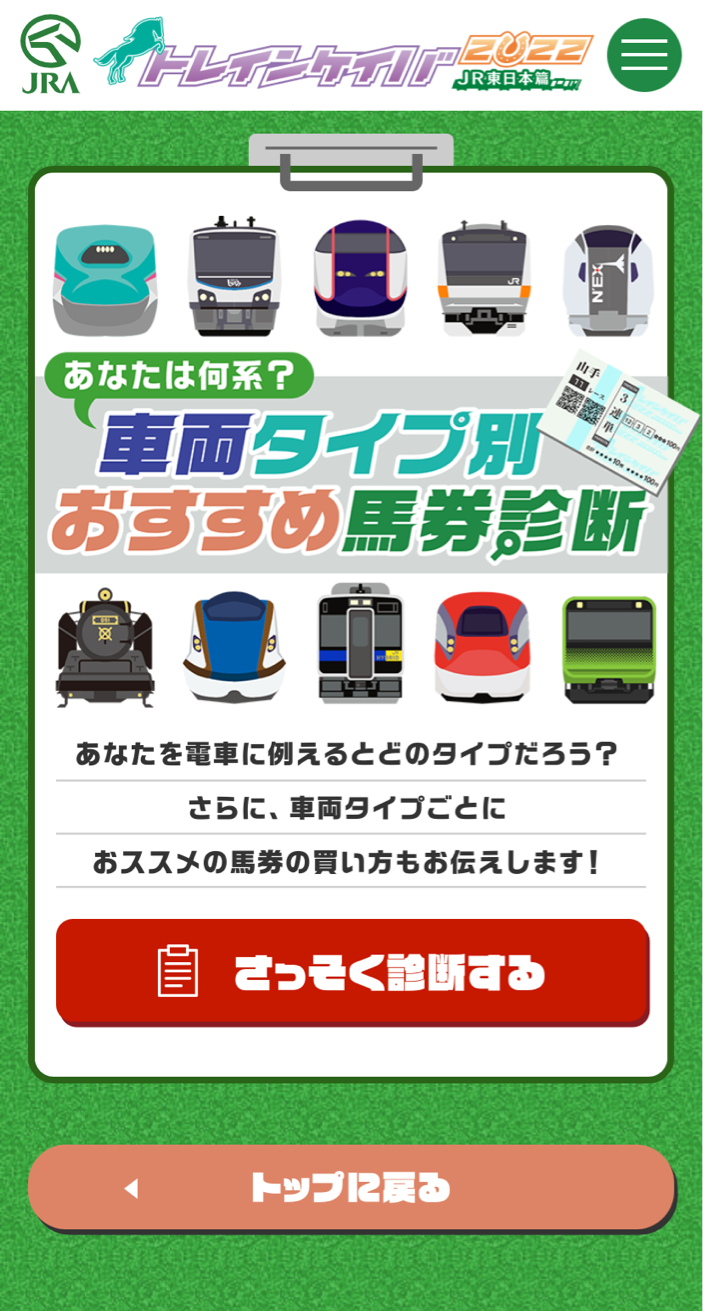 全6問の鉄道に関する質問に答えるだけで、性格を10種類のJR東日本の車両で表現します。さらに車両別におすすめの馬券の買い方も診断します。自分のお気に入りの車両が出るか、挑戦してみてください!