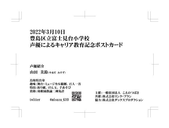 一般社団法人「こえのつばさ」(所在地:京都市上京区 代表理事:渕之上久也)は、2022年3月10日(木)に東京都豊島区立富士見台小学校、豊島区立千川中学校において声優の山田美鈴さんを招き、声優・アニメ業界としての職業紹介および子どもたちに読書の大切さを伝えるキャリア教育を開催いたします。