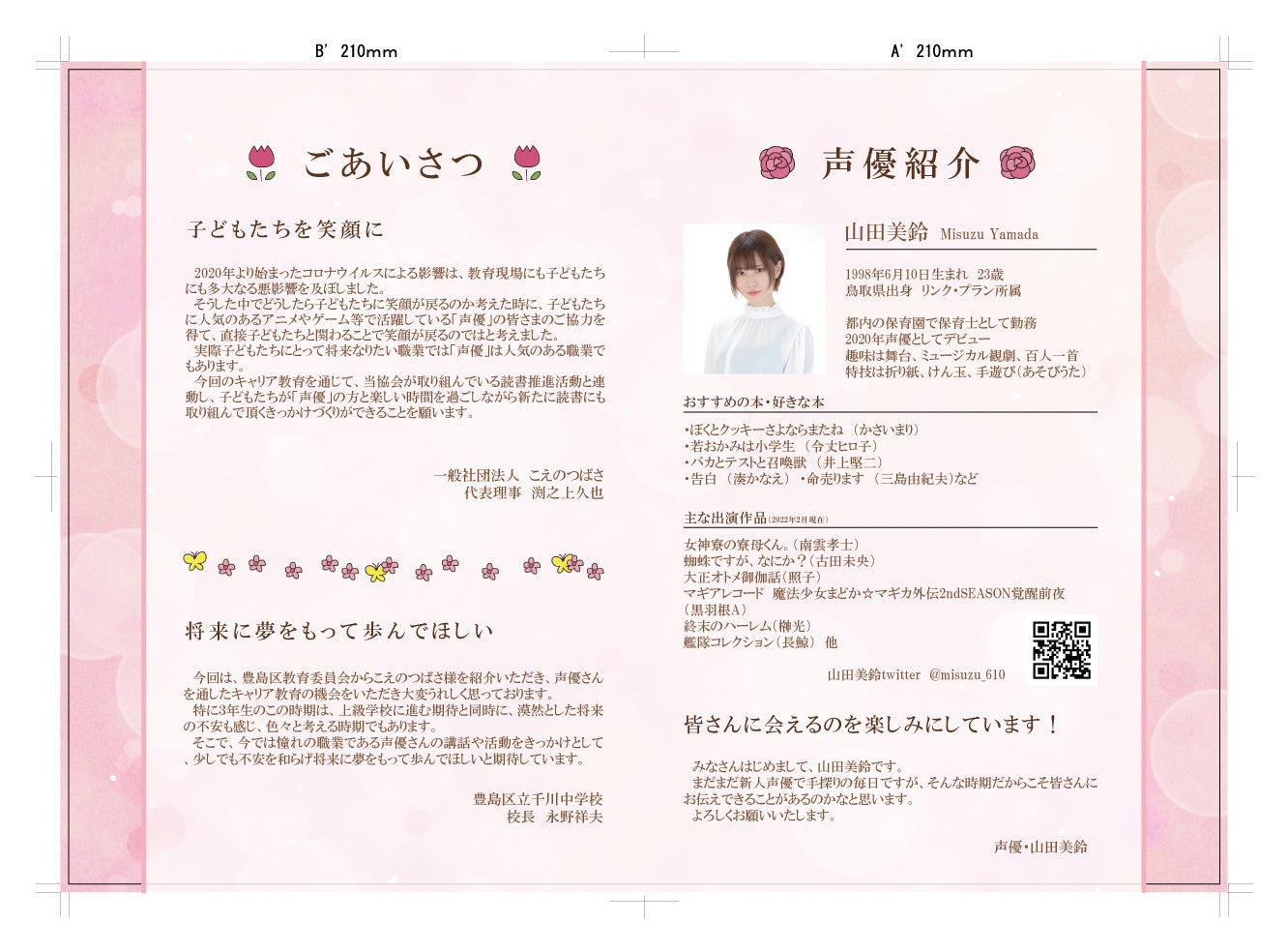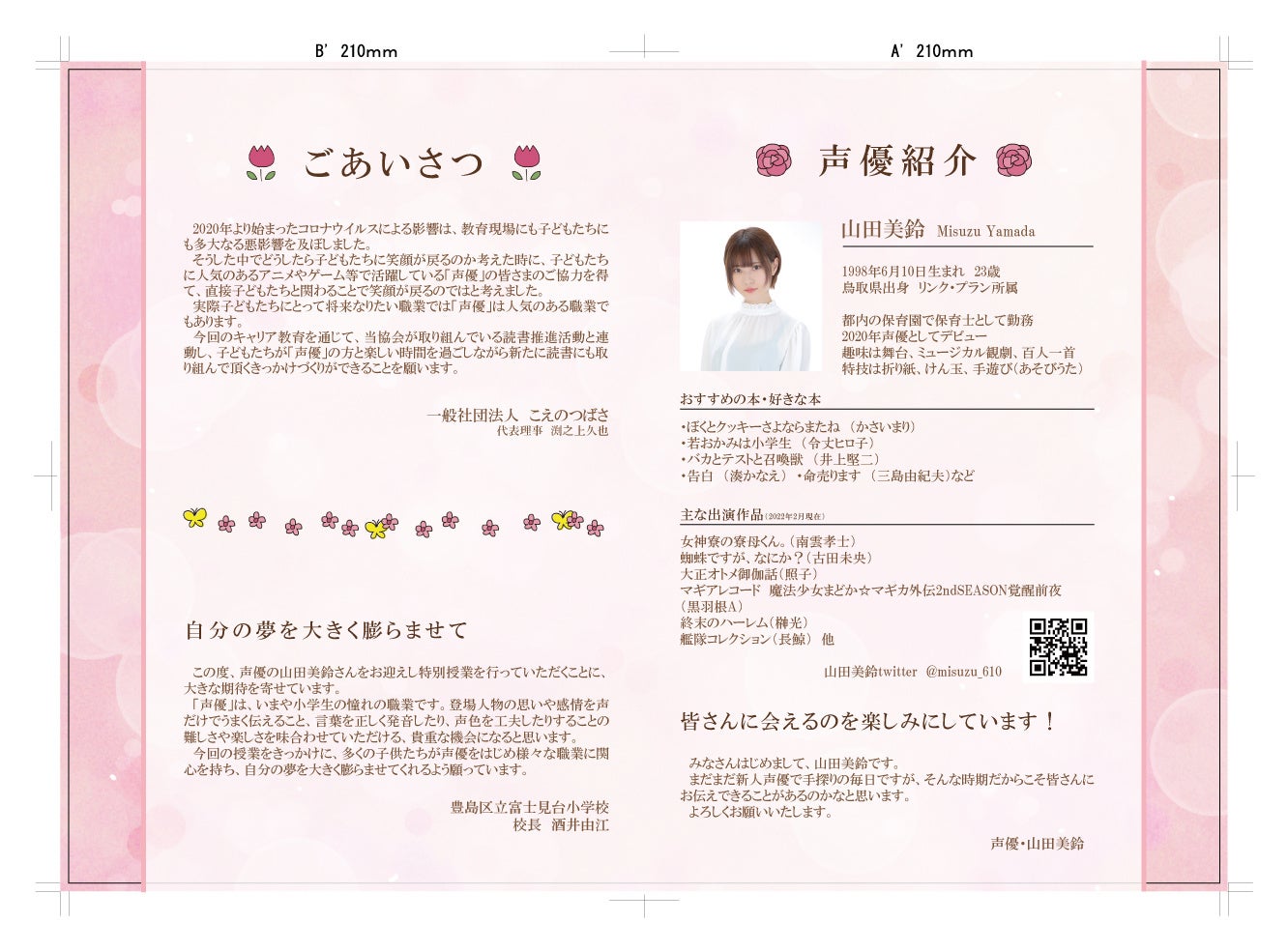 コロナウイルスによる影響は、子どもたちにも甚大なる悪影響を与えました。そうした中で子どもたちに笑顔が戻る方法を考えたときに、現在子どもたちに人気のあるアニメやゲーム等で活躍し、声優のお仕事をする前は都内の保育園で保育士として子どもたちと関わるお仕事をされてた実績を持つ声優の山田美鈴さんのご協力を得まして、今回初めて声優が学校現場に訪問し直接子どもたちと触れ合うキャリア教育を実施する運びとなりました。子どもたちに関心の高いアニメ声優業界の話や朗読を通じた読書の大切さを語っていただき、子どもたちが将来の夢や希望を持てるキャリア教育を開催いたします。