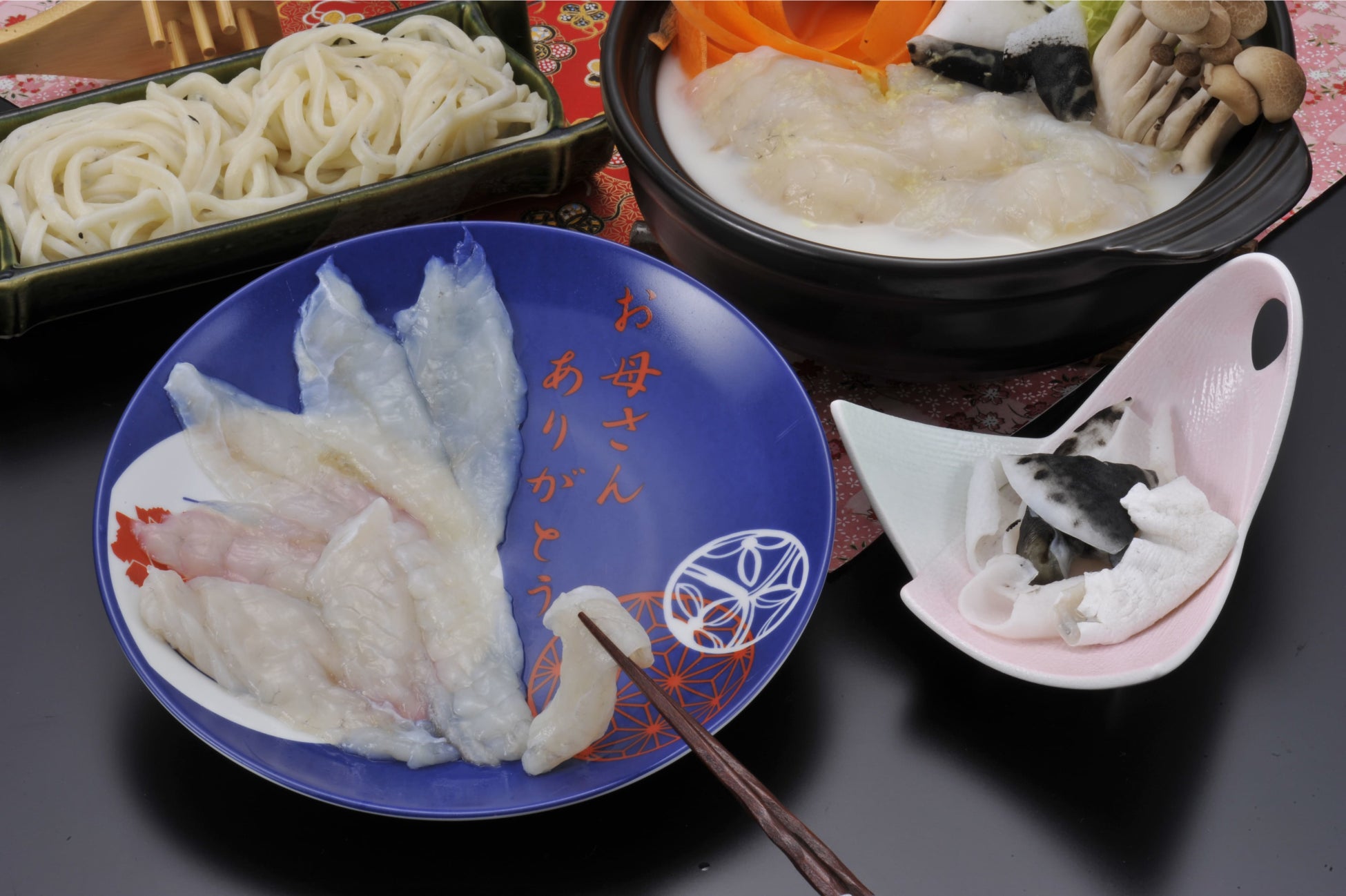 コラーゲンたっぷりのふぐ皮を練り込んだ「ふぐべっぴんうどん」はコシもありしっかりとした歯ごたえ。