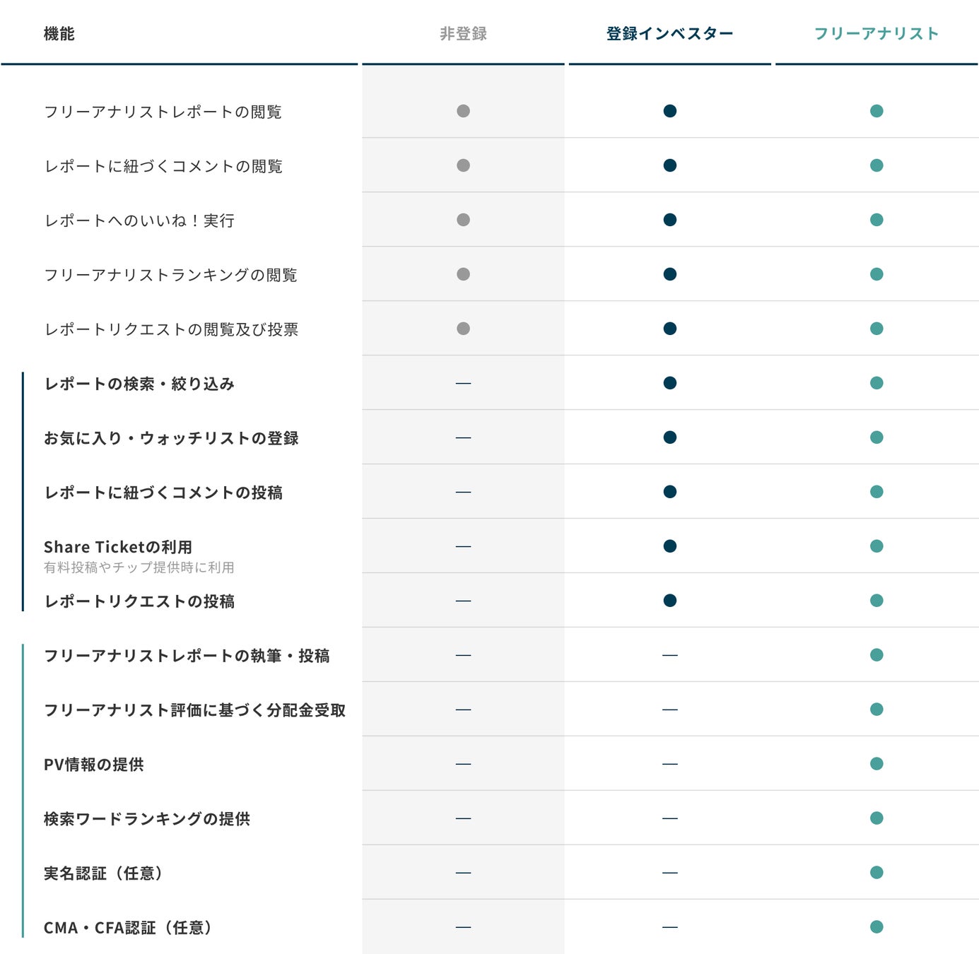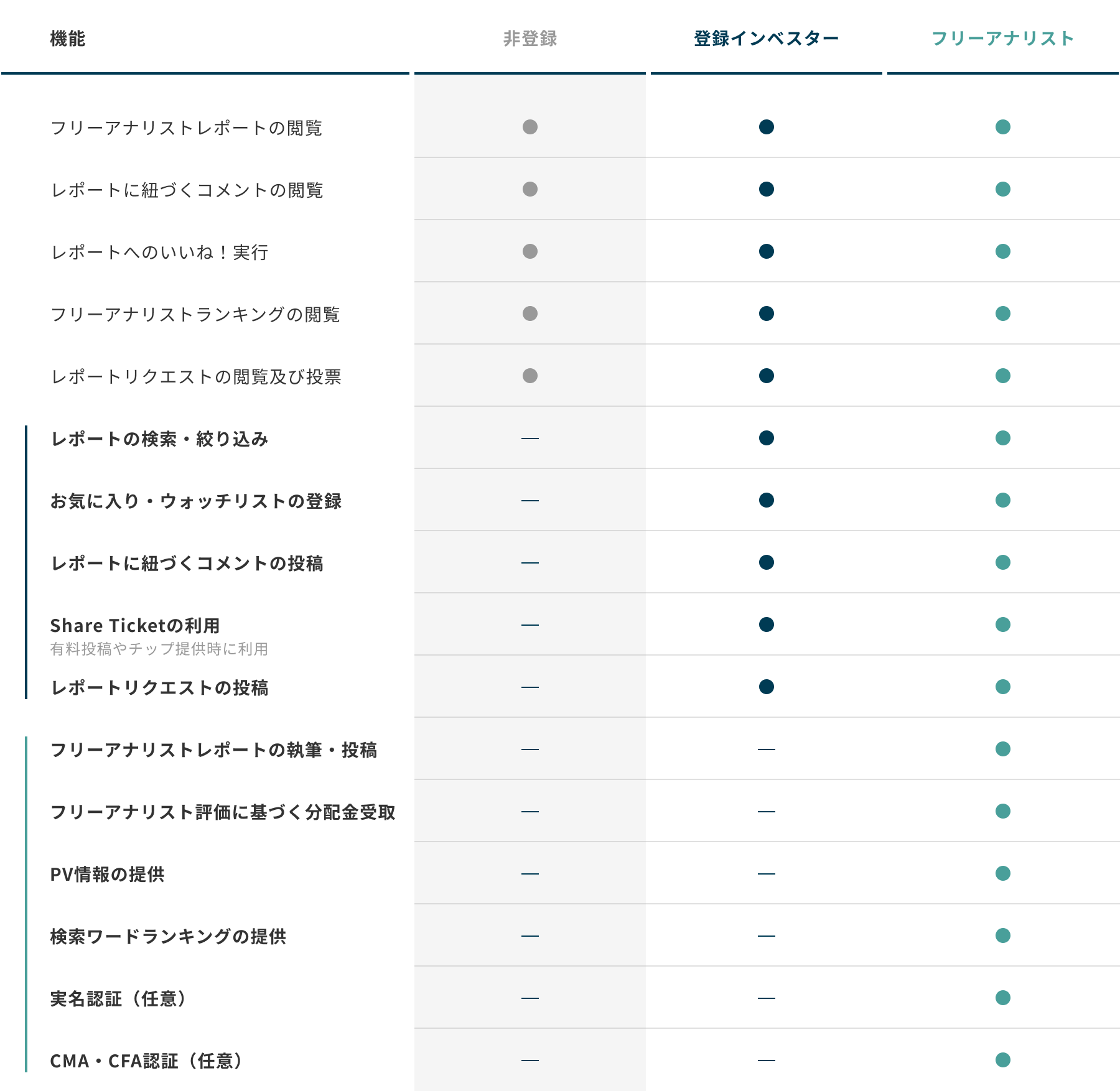 フリーアナリストレポートを執筆し調査内容を公開・収益化するための「フリーアナリストプラン」、フリーアナリストレポートの閲覧やコメントのやり取りを通じて企業・株価理解を深めるための「登録インベスタープラン」を設けており、調査業務経験者/株ブロガー・インフルエンサー/個人投資家/証券営業従事者をはじめ、株式投資に興味を持つ方のご利用を想定しております(上場企業IR担当者様のご利用を想定した「上場企業公式プラン」も後日公開予定です)。