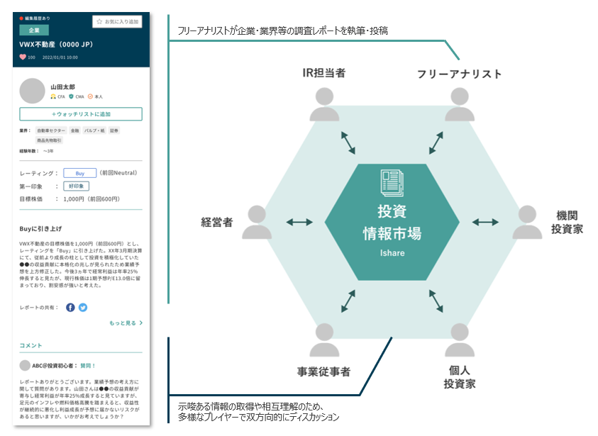一方で、株式投資に役立つ情報は十分に普及しておりません。個人投資家が持つ投資情報は機関投資家に遠く及ばず、また企業経営者の経営意思は限定的にしか投資家に届いていません。そのような投資情報市場の在り方を変えたいと考え生み出したのが、リサーチプラットフォーム「Ishare」です。