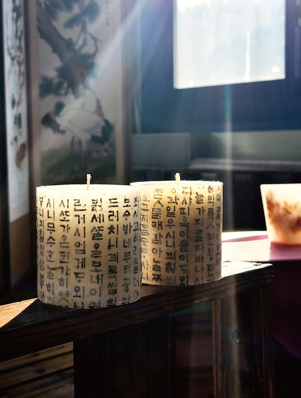 この作品は、ハングルをただプリントしたのではなく、ハングルの書かれた「韓紙」を蝋の中に閉じ込めて、蝋で容器を作り、その中にフレグランスキャンドルを入れて作ったキャンドルで、外(入れ物)も蝋でできている。火を点けると、内側のキャンドルが優先的に溶け、外が(入れ物)が残る仕組みになっている。この技術は韓国で特許を取得しており、内側の蝋が溶けていくと、提灯のように韓紙が透けて、光が漏れる。技術的に面白い作品で、炎の向きや、風向きで、外(入れ物)の蝋も溶けていくこともある。1点1点手作りで作っているので、全く同じ容姿のものがなく、最後まで蝋が溶けて行く様子にもヒストリーがあり魅力的だ。