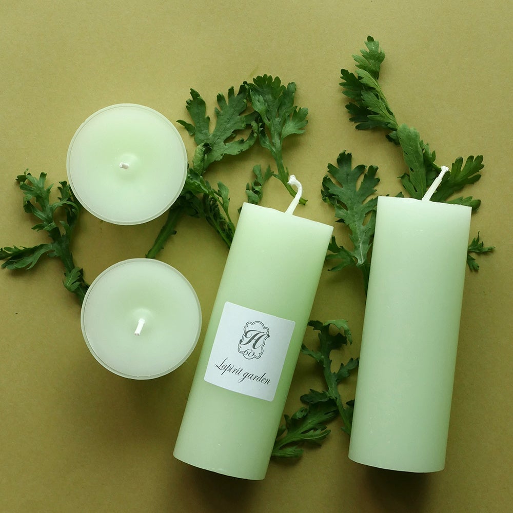 「よもぎキャンドル」は3年以上乾燥させたよもぎのみを使用し、キャンドルになった時に、よもぎ本来の薫りが引き立つよう工夫されている。これも着色料、香料不使用。原材料本来の色、香りを楽しむことができる。