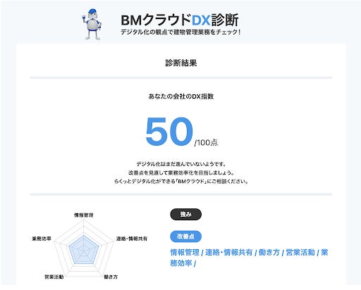 BMクラウド DX診断は、不動産管理会社・ビルメンテナンス会社の社内DX推進の観点から現状の課題を独自の指標により診断するサービスです。15の診断項目への回答結果に基づきDX推進における企業の強みと弱みを診断します。現場における煩雑な雑務の固まりである建物管理業務において、不動産管理会社・ビルメンテナンス会社が自社の現状を把握し、DXを円滑に推進するポイントを理解することで、着実なDX推進を支援いたします。