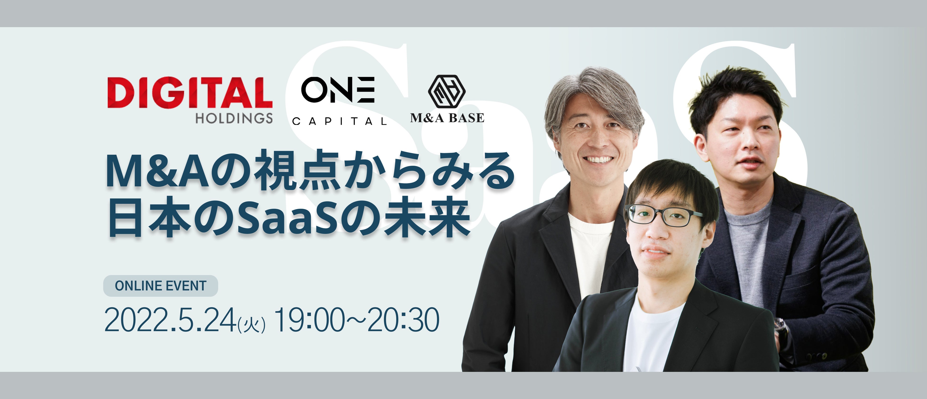 M&A BASE株式会社(本社:東京都中央区、代表取締役:廣川 航)は、株式会社デジタルホールディングス グループ CIOの石原 靖士氏、One Capital株式会社 プリンシパルの盛島 正人氏をお招きし、オンラインイベント「M&Aの視点からみる日本のSaaSの未来」を2022年5月24日(火)に開催します。