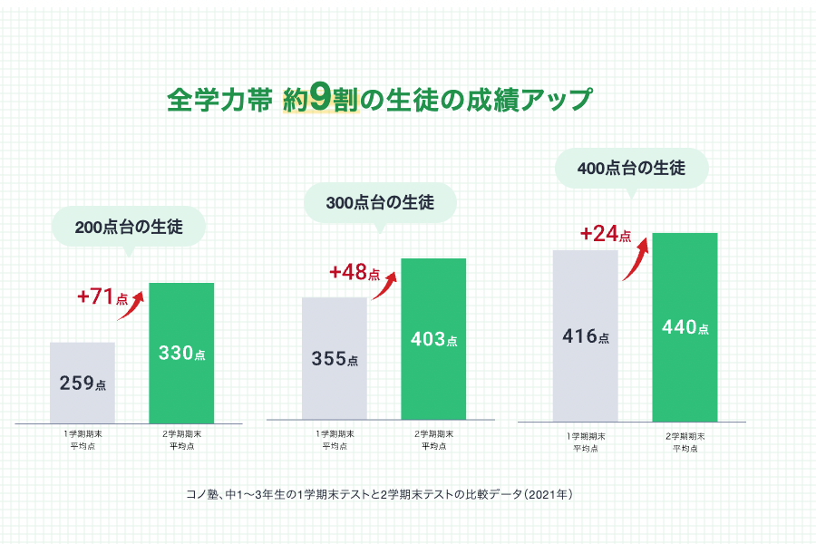 「個別指導 コノ塾」では、全ての学力帯の生徒が成績アップを実現しています。