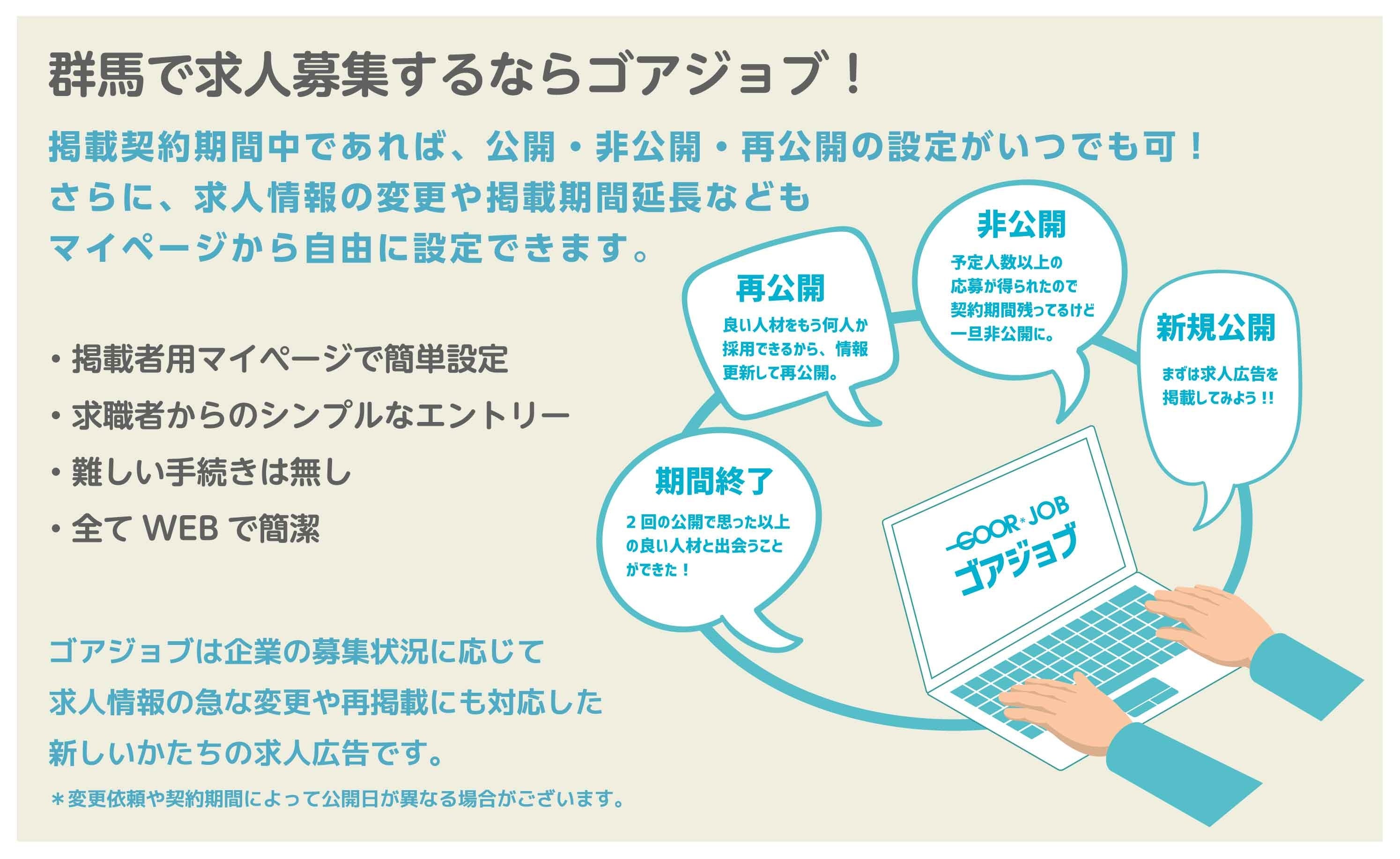 『GOOR*JOB(ゴアジョブ)』は、群馬県で働きたい求職者の皆様と、求人募集をされる企業様に安心して気持ちよくご活用いただけるサイトを目指してまいります。