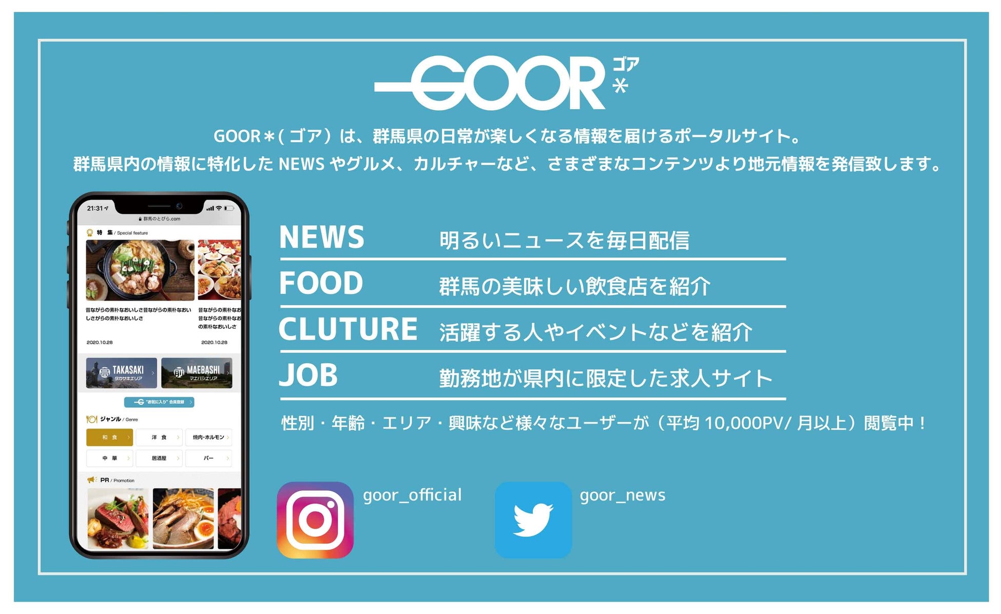 ニュースサイト『GOOR*』は、群馬県の日常が楽しくなる情報を届けるポータルサイト。群馬県内の情報に特化したニュースやグルメ、カルチャーなど、さまざまなコンテンツから地域の情報を発信しています。