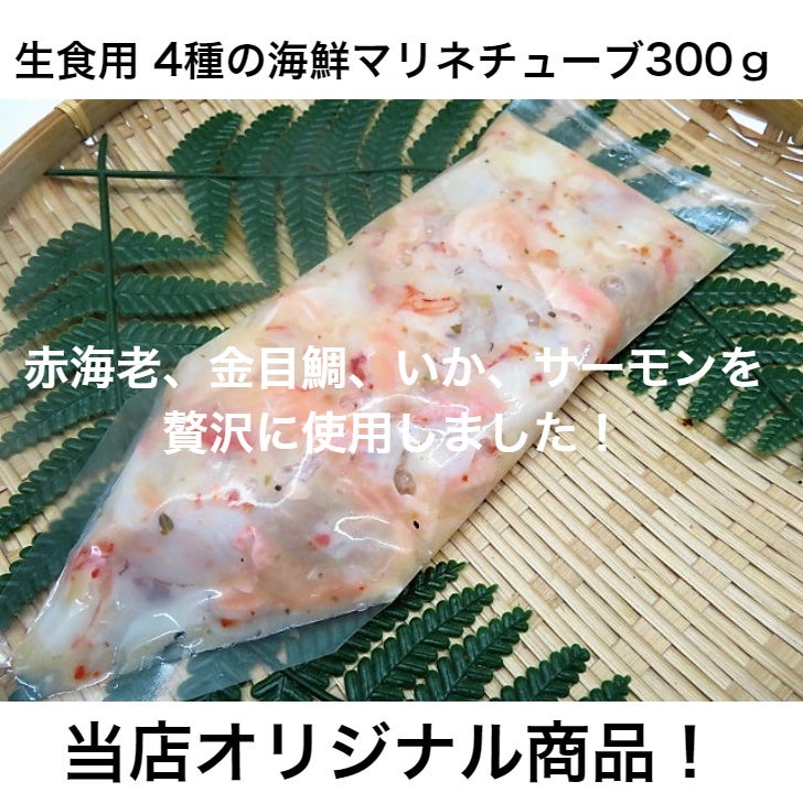 当店オリジナル商品の4種の海鮮マリネチューブ300gのご案内です!生食用の赤海老、サーモン、ヤリイカ、金目鯛とオリジナルソースを合わせて、マリネ風に仕上げました!