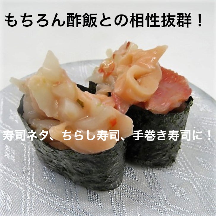ソースには玉ねぎ、ビネガー、ブラックペッパー、レモン果汁等が入っており、お魚の臭みを消し、食べやすくなっております。もちろん酢飯との相性抜群ですので軍艦ねた、巻き寿司ネタ、ちらし寿司、手巻き寿司に最適です。料理のレパートリーも数多く、サラダ、パスタ、サラダ丼、おつまみ等にも最適!