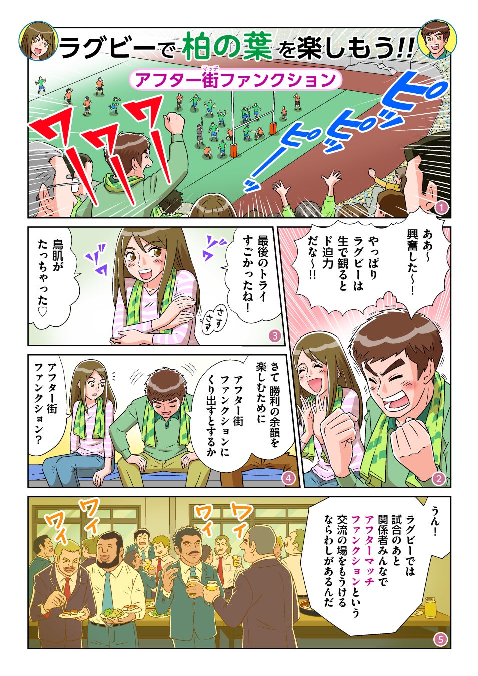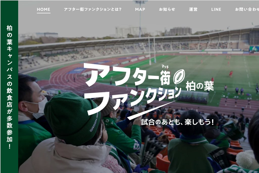 紳士の国イギリスを発祥とするラグビーでは「アフターマッチファンクション(After match Function)」と言って、試合が終わったらノーサイド、敵味方関係なくお互いを讃え合い飲み語らう「交流会」があります。「柏の葉アフター街ファンクション(街をマッチと読んでください!ダジャレです)」は、その素晴らしい文化を継承し、ラグビー選手や関係者はもちろん、柏の葉キャンパス地区にお越しのビジターゲストや地元ファン同士が試合後に語らいあう場所を街ぐるみで提供し、新たな賑わいやムーブメントを起こすことを目的とした、新しい地域プロジェクトになります。