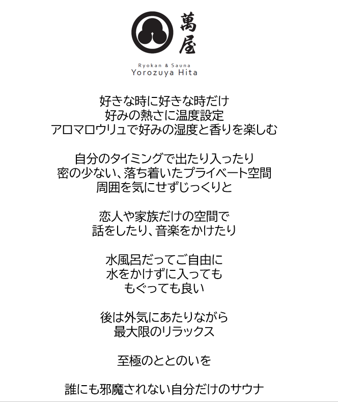 大分県日田市の温泉旅館「よろづや」を運営する株式会社萬屋(所在地:大分県日田市隈1丁目3-12、代表取締役:大石 宗弘)は、創業100年を迎え、この度「温泉旅館」から全客室に水風呂付プライベートサウナを完備した『サウナ旅館』として全面リニューアルいたします。