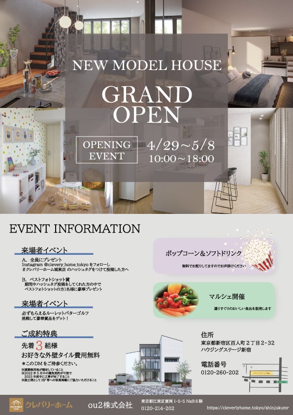 東京23区を中心に、東京ならではの注文住宅を建設しているou2株式会社(本社:東京都江東区、代表取締役:長張 隆史、以下ou2)は、2022年4月29日、クレバリーホームブランドのモデルハウス( https://cleverlyhome.tokyo/shinjukumr )を新宿にグランドオープンします。