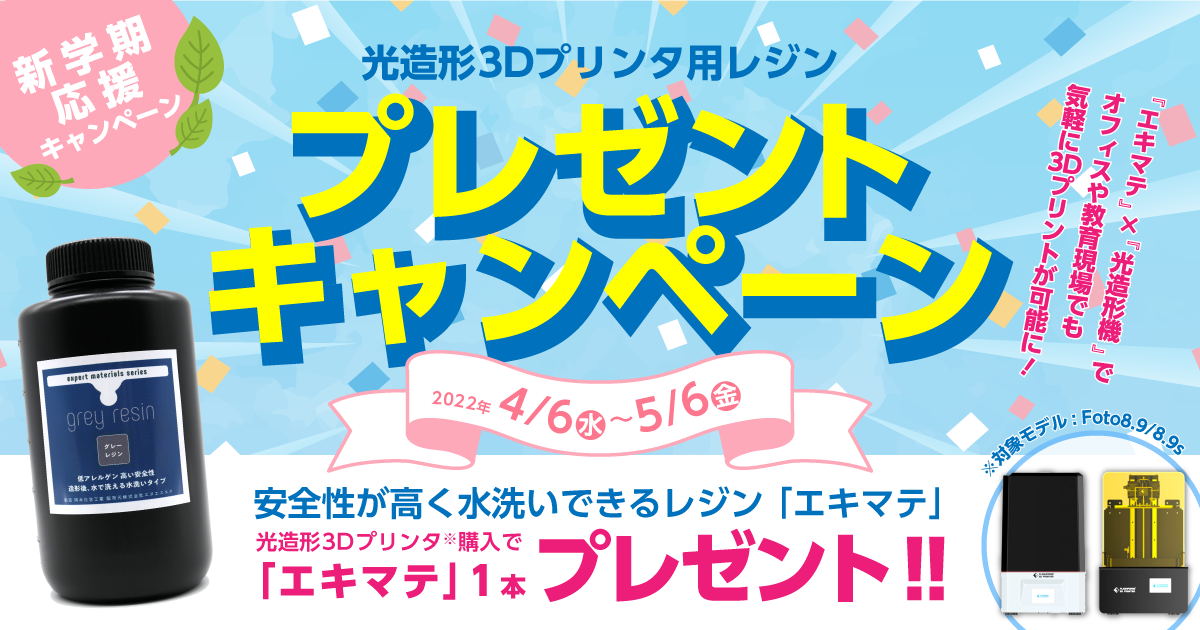 FLASHFORGE正規販売代理店及び日本製低アレルゲン水洗いレジン「エキマテ」の販売元である当社は、新学期応援キャンペーンとしてFLASHFORGE製LCD方式光造形3Dプリンタ「Foto8.9」「Foto8.9s」を当社ECサイトからご購入いただいた方に限定で、「エキマテ」をプレゼントするキャンペーンを実施いたします。